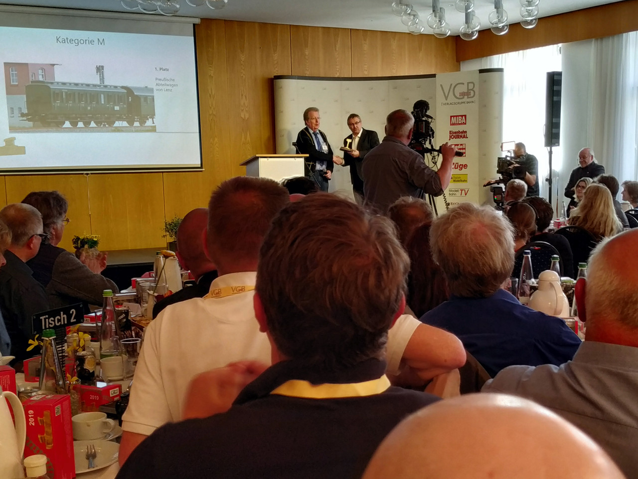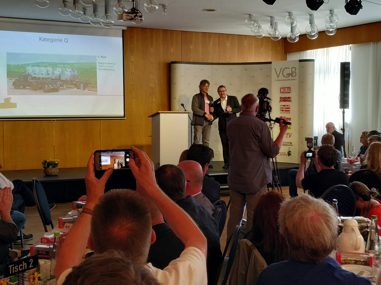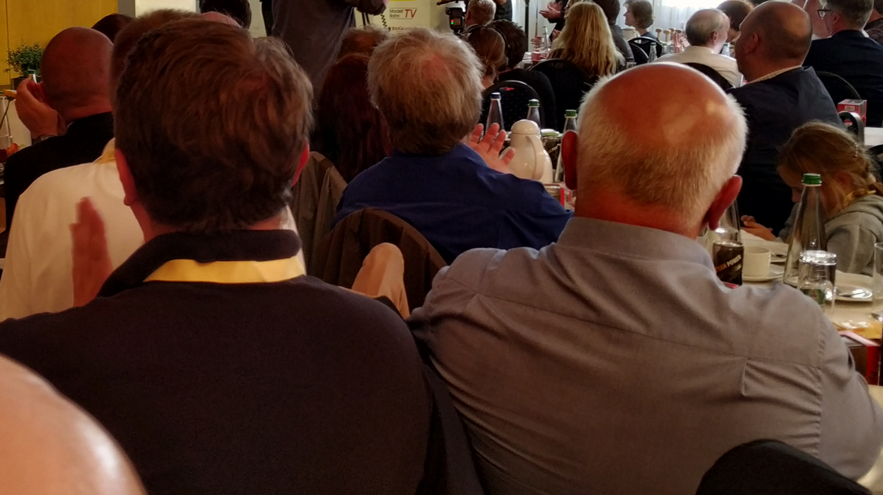 …und Hagen v. Ortloff moderiert in gewohnt lockerer Weise die Preisverleihung. Im Bild, stellvertretend für alle Preisträger die Übergabe des goldenen Gleises durch Martin Knaden, Chefredakteur der MIBA, an Bernd Lenz und an Michael Schnellenkamp.