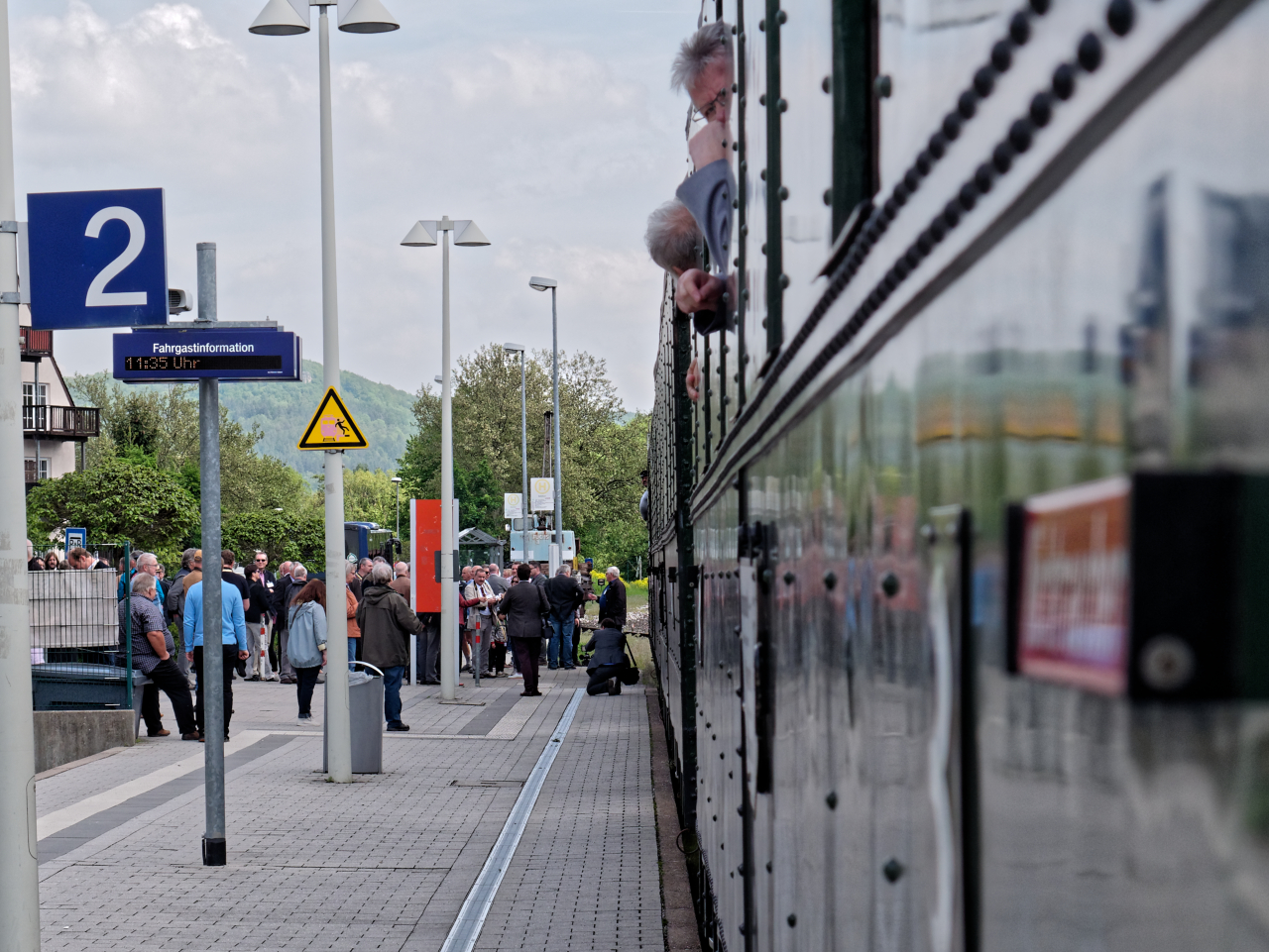 Der Sonderzug hat den Bahnhof verlassen und befindet sich nun unter der Wegüberführung kurz vor dem Bedarfshaltepunkt „Wilhelmshöhe“. Auch HvO war an Bord, selbstverständlich auch eines (von mehreren) Videoteams.