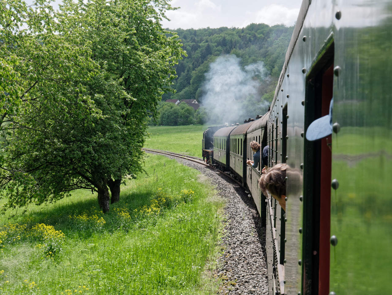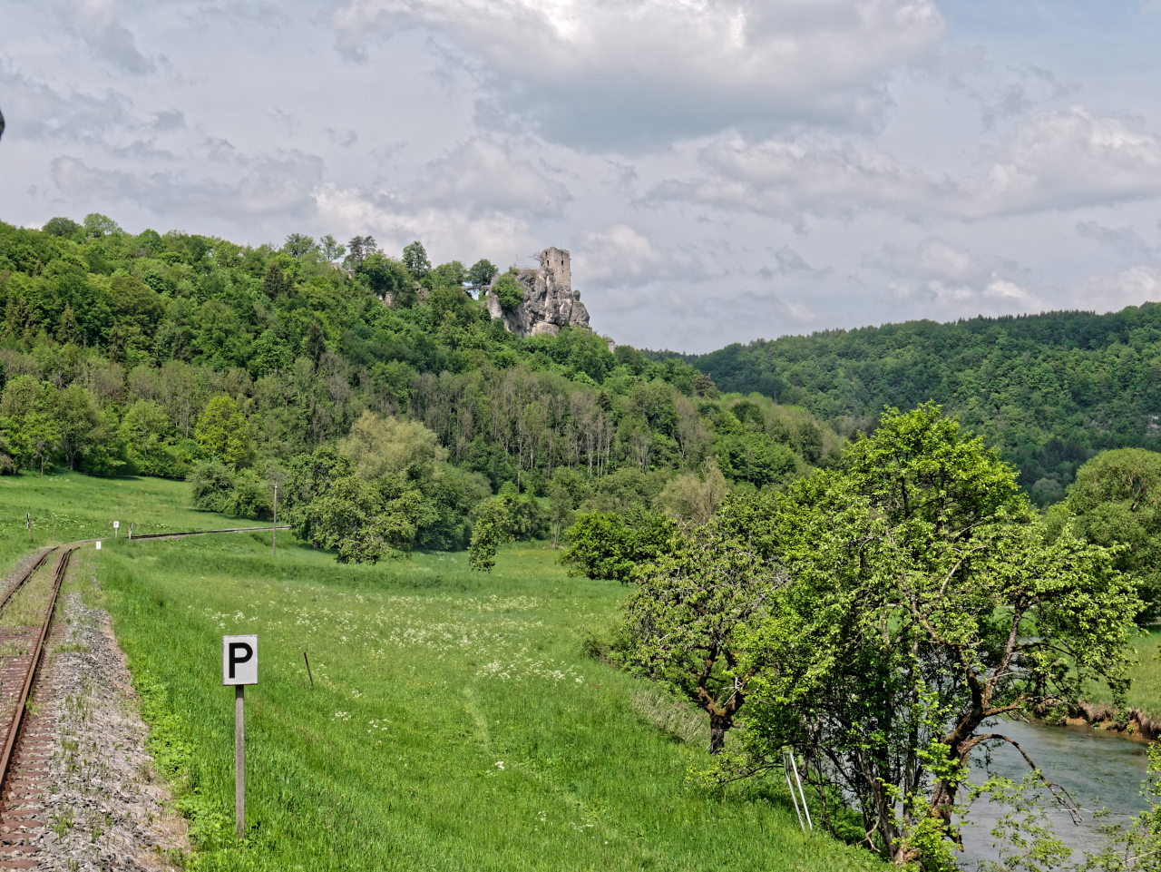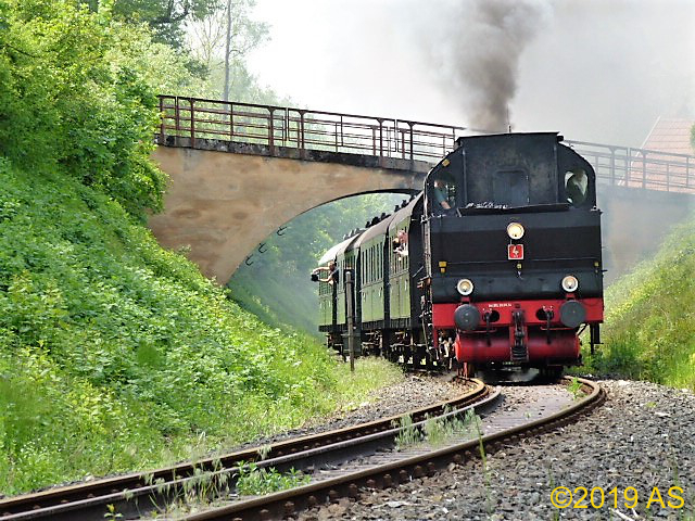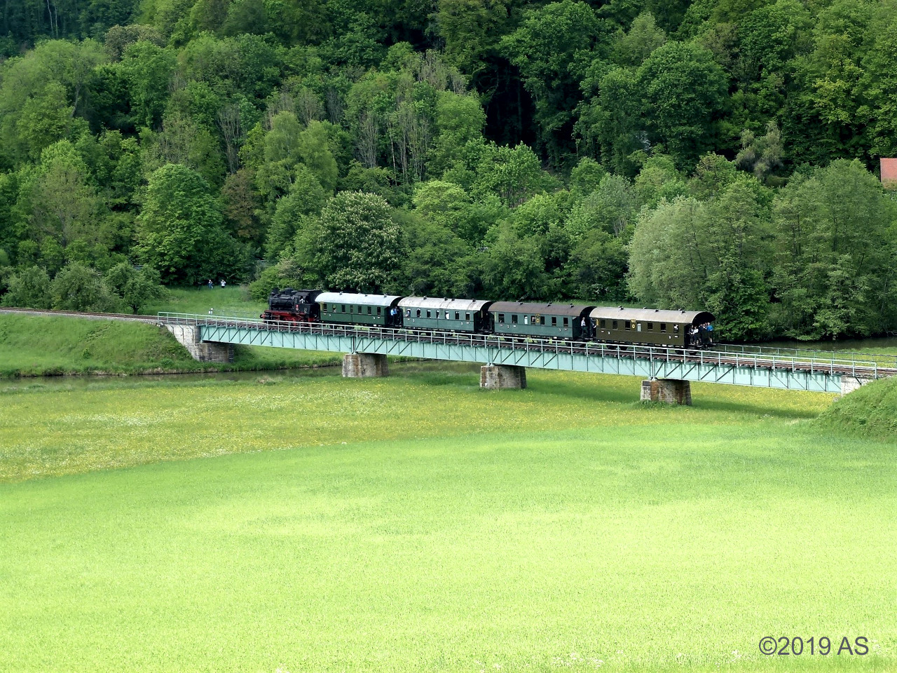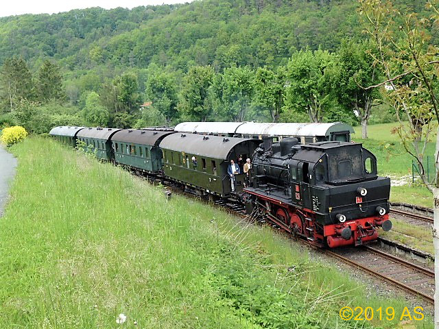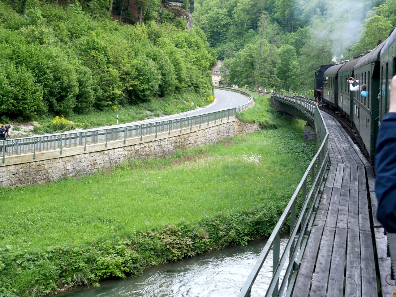 Unser Sonderzug überquert die Wiesent auf der Brücke unterhalb der Ruine Neideck. Wir hatten die Neideck bereits umfahren, da musste ich aber nochmal einen „Nachschuß“ wagen.