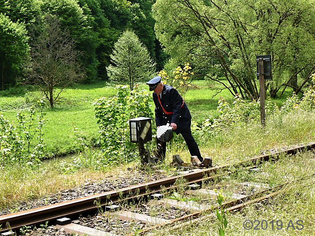 Inzwischen wurde die Lok umgesetzt. Der Zugführer legt im Endbahnhof die Weiche um.