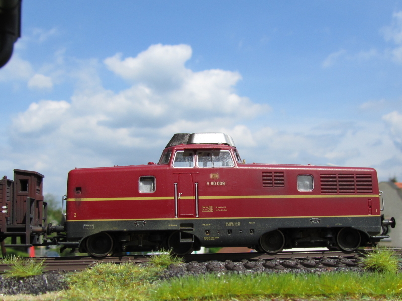 Die V80 009 auf ihrer ersten Fahrt bei Sonnenschein…