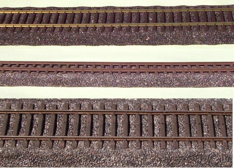 …das wäre natürlich sehr einfach. Nein. Ich habe die Schienenprofile herausgezogen und mit dem Pinsel bemalt. Als Farbe kam Hobby Color Staubbraun #456 zur Anwendung. Nach dem die Farbe trocken war habe ich die Profile wieder eingezogen und die Oberseite ein wenig „gereinigt“. Die Abfolge von unbehandelt bis behandelt zeigt das Bild: