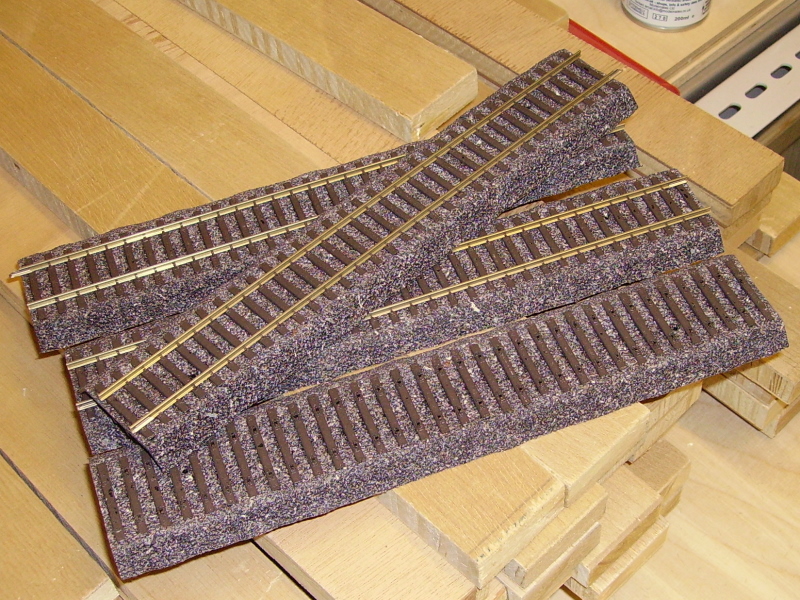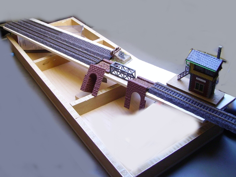 Der Unterbau wird aus Tischlerplatten-Rahmenhölzern (40*16mm) und Multiplex bzw. Sperrholz erstellt. Die Gleise sind von Conrad (ex Röwa/Ade-Gleis). Probeweise habe ich eines davon schon um die Gleisprofile beraubt. Das weitere Ausstattungsmaterial ist die kleine Brücke (derzeit in Einzelteilen) das Vollmer Stellwerk und von Kibri der Prellbock. Hier die Bilder dazu: