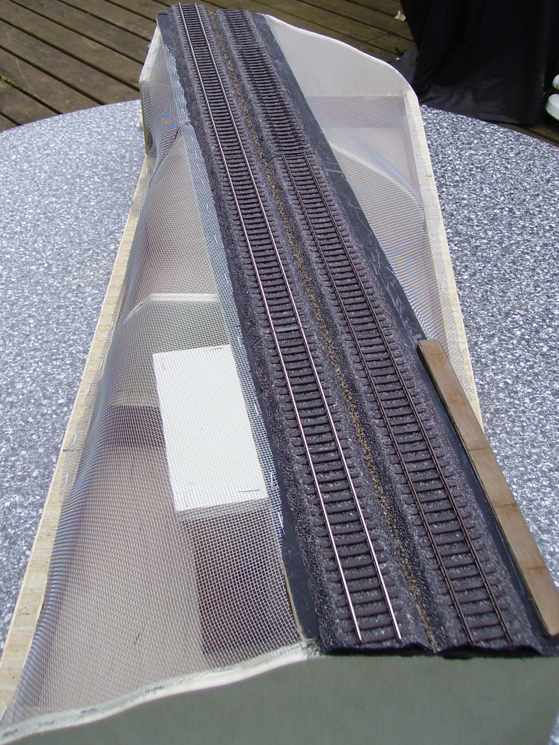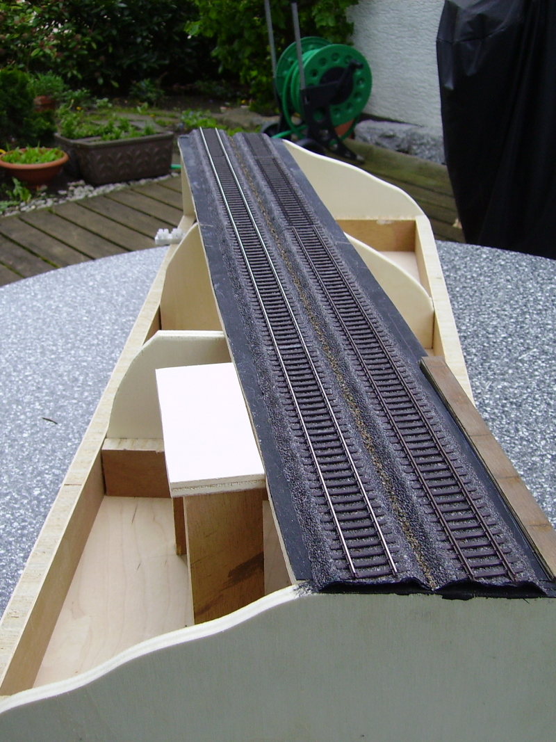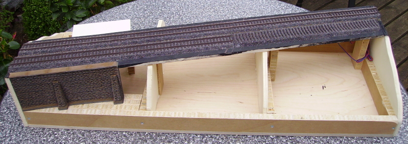 Inzwischen habe ich eine Stützmauer angebaut und den Modulkasten mit Spanten versehen. Ein Gleis-Anschlußkabel mit Lüsterklemmenkupplung wurde von mir auch eingebaut.