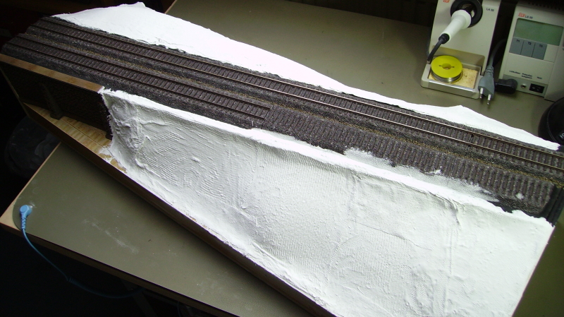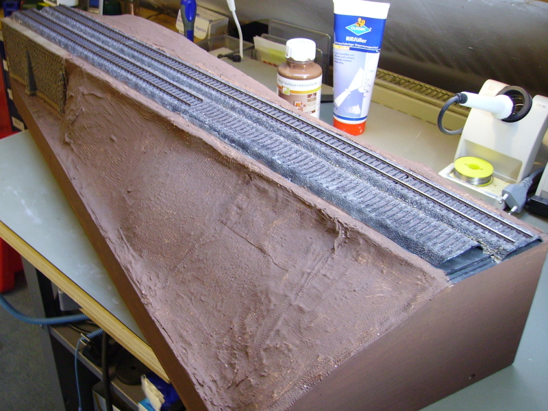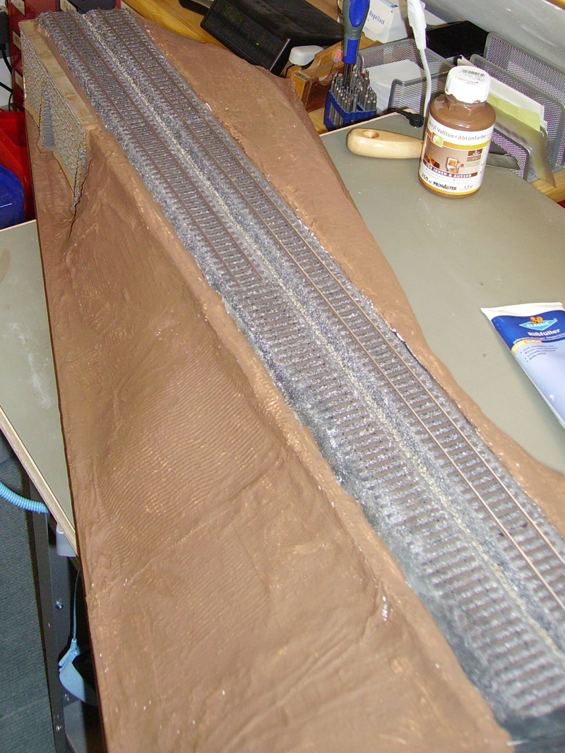 Das ist schon ein Teufelszeug. Hartmann Cellona Gipsbinde 2m*20cm in der Apotheke gekauft ist preiswerter, als im Moba-Fachhandel! Ablängen, eine Sekunde in lauwarmes Wasser tauchen, abtropfen lassen, auflegen. Nach ca. 10 Minuten beginnt der Gips auszuhärten.