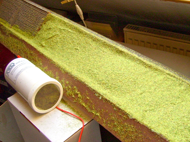 Kaum war die Farbe trocken, musste Gras gesäht werden. Dabei habe ich mich zum erstenmal mit der 10.000 Volt – Methode des Gras ansähens befasst. Braun grundierte Fläche mit Graskleber eingestrichen, Gras.O.Mat befüllt, Batterie eingesetzt, Kabel gesteckt… und ab ging die Post! Das Bild zeigt den frisch angesähten Grasbewuchs. Wenn der Kleber getrocknet ist, werde ich die überschüssigen Fasern absaugen (und sehen, was übrigbleibt).
