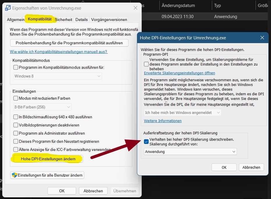 Sollte die Programmdarstellung (Schrift) etwas unscharf erscheinen, lÀsst sich das schnell beheben. Mausklick rechts auf die Programmdatei Umrechnung.exe, Eigenschaften | KompatibilitÀt auswÀhlen und dann Hohe DPI-Einstellungen Àndern (siehe Abbildungen).