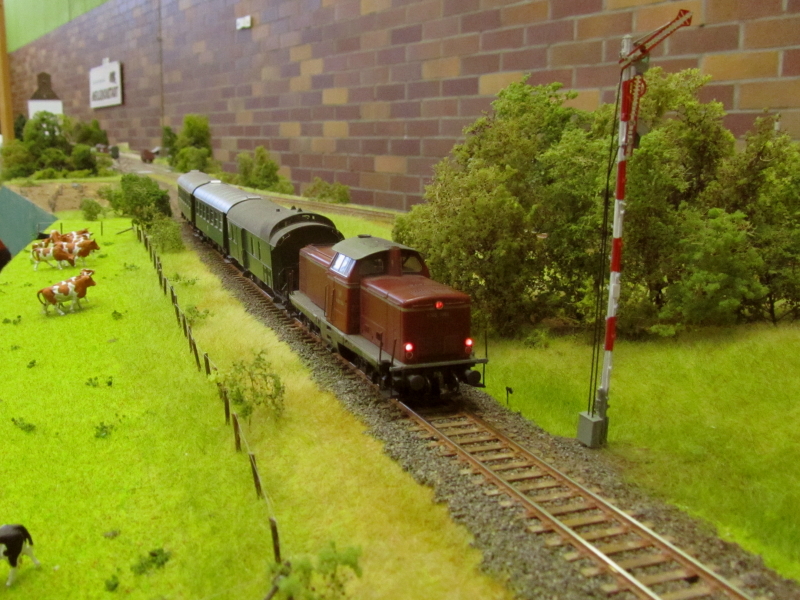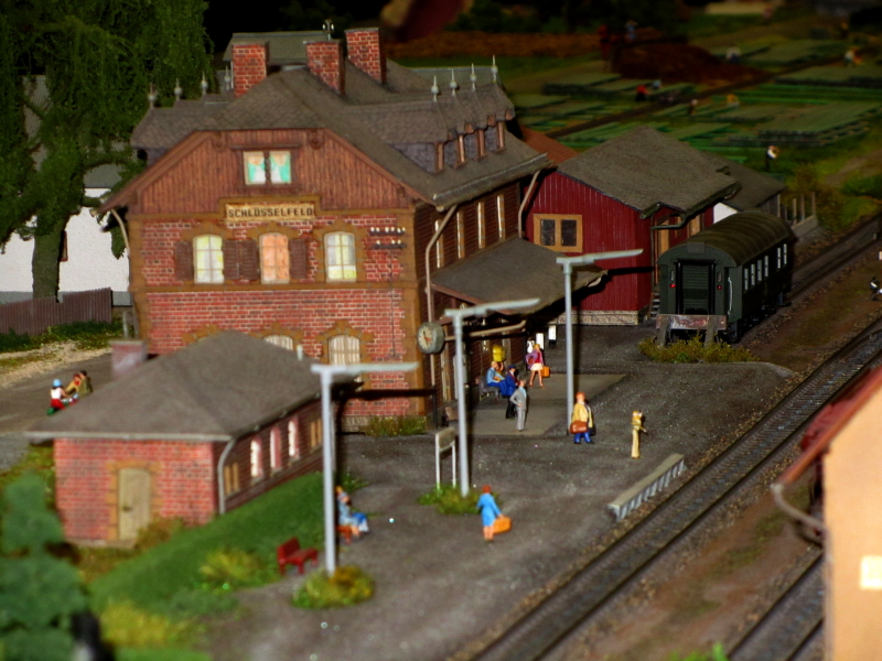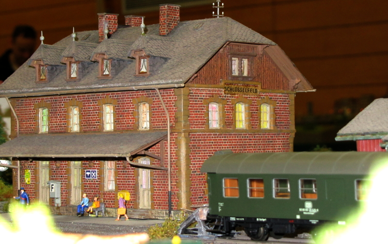 Ich war Ă€uĂerst positiv ĂŒberrascht von den ausgestellten Anlagen. Der verstanstaltende Club zeigte seine inzwischen auf geschĂ€tzte 20 Meter gewachsene Modulanlage mit der Nachbildung des SchlĂŒsselfelder Bahnhofes. Die GebĂ€ude sind authentisch nachgebildet und entstanden in Handarbeit. Gleismaterial und rollendes Material sind von MĂ€rklin: