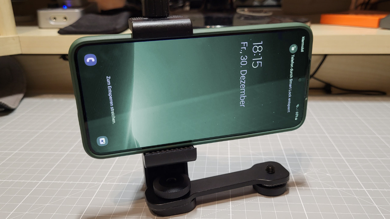 Um ein brauchbares und tief liegendes Table-Top Smartphone Stativ zu erhalten ging ich daran auszuprobieren, wie die Teile anzuordnen sind. Es hat funktioniert. Die Ausrichtung horizontal und vertikal nahm ich auf dem Werktisch vor, ein Schreinerwinkel genĂŒgte fĂŒrs Erste meinen AnsprĂŒchen.