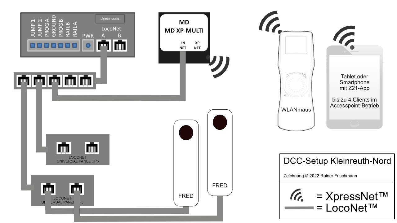 Ich habe eine Digitrax Zentrale und möchte diese gerne zusammen mit der WLANmaus von Roco verwenden. Dazu mĂŒssen gleich zwei Ăbersetzungsschritte erfolgen: Von XpressNet zu LocoNet einerseits und andererseits muss das WLAN irgendwie an die Zentrale ran, selbst wenn diese nicht fĂŒr den Betrieb mit WLAN-GerĂ€ten eingerichtet ist.