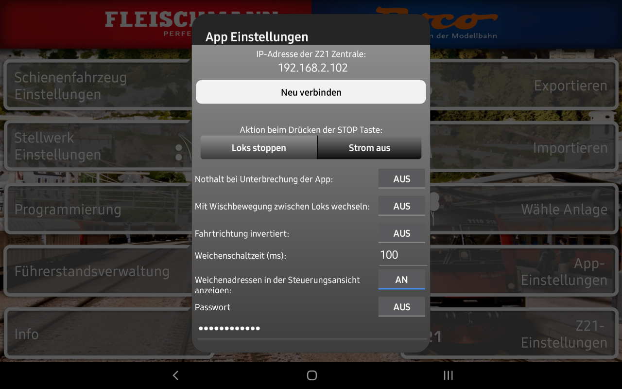 Nach diesen Eingaben wechselt die WLANmaus automatisch oder per MenĂŒ-Auswahl auf den Lok-Modus. Auf dem Display wird die WLAN-Verbindung mit FeldstĂ€rke angezeigt. Jetzt kann ich mit meiner vorhandenen Zentrale auch mit bis zu vier WLAN-fĂ€higen MobilgerĂ€ten die Loks bedienen. Ich bevorzuge einen Fahrregler mit physischen Tasten und richtigem Regler und habe mir daher die WLANmaus von Roco geleistet. Wer sich diese Ausgabe sparen möchte, spielt die Z21-Software auf sein MobilgerĂ€t und benutzt dieses.
