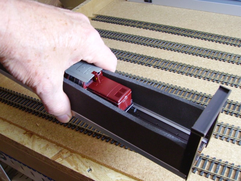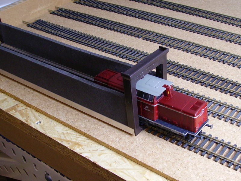 Der Personenzug 7420 mit V100 1075 und 6 Umbauwagen-(3yg)-PĂ€rchen fĂ€hrt in Gleis 2 ein. Er zieht vor bis etwa 30 cm vor dem Prellbock und kuppelt dort ab. Die V100 wird bis zum Prellbock vorgezogen und befĂ€hrt dabei den Peco Loco Lift SL-43. Mit dieser genialen „Greif- und Aufgleishilfe“ wird die Lok entweder im Bereich Gleis 6, 61-63 wieder auf das Gleis gesezt und abgestellt oder gleich wieder ausfahrfertig an den Zug auf Gleis 2 gestellt und angekuppelt.
