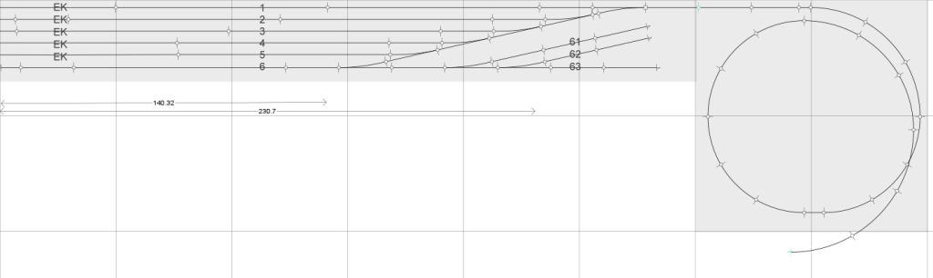 Hier ist nun der endgĂŒltige Plan (gezeichnet mit AnyRail) fĂŒr den Abstellbahnhof. Von der Strecke kommend fĂŒhrt die Gleiswendel von Höhe +15 auf Höhe 0 hinunter. Der Abstellbereich bietet 6 Gleise mit einer NutzlĂ€nge zwischen 140 und 230 cm. Die Gleise 1 bis 5 dienen dem Abstellen von kompletten Zuggarnituren. Im linken Bereich von Gleis 6 werden Triebwagen (z.B. VT98, ETA 150) abgestellt und auf den Gleisen 61-63 im rechten Teil können Loks auf Ihren nĂ€chsten Einsatz warten.