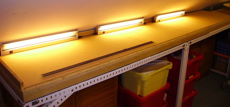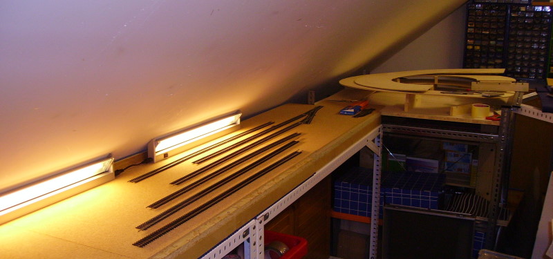 Damit im Abstellbahnhof nicht immer Dunkelheit vorherrscht, ĂŒberlegte ich, wie dieser zu beleuchten wĂ€re. Von LED-Lichterketten ĂŒber Lichtschlauch und Leuchtstoffröhren gingen meine Ăberlegungen. Genau zu diesem Zeitpunkt gab es bei meinem Lieblings-Discounter (Feinkost Albrecht oder in kĂŒrzerer schreibweise ALDI) Unterschrank-Lichtleisten im Angebot. Gekauft, zwischengelagert und jetzt eingebaut.