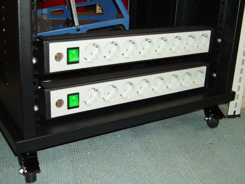 Nachdem ich das Rack (Bausatz von Thomann) zusammengeschraubt hatte, habe ich die EinschĂŒbe und die Steckdosenleisten montiert. Die SteckdosenflĂ€chen sind absichtlich auf der Frontseite nach auĂen gelegt und schaltbar. Dahinter, auf der Bodenplatte des Racks, werden die Trafos plaziert.