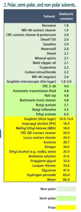 In der Tabelle [2] habe ich die Dielektrizitätskonstante für eine Reihe von Lösungsmitteln, Kontaktreinigern, Leiterbahnreinigern und dergleichen aufgelistet. Bei der Erstellung dieser Tabelle gehe ich davon aus, dass eine Dielektrizitätskonstante von 3,0 oder weniger ein unpolares Lösungsmittel für unsere Zwecke darstellt. Ich nehme an, dass eine Dielektrizitätskonstante von 10,0 oder mehr bedeutet, dass das Lösungsmittel polar ist. Alles, was dazwischen liegt, ist semipolar.