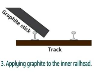 Wenn Sie Graphit auf Ihr Gleis auſtragen, um zu verhindern, dass die Schienen einen Mikrolichtbogen bilden, ist mehr Graphit nicht besser! Ich sage den Leuten, dass ein schneller Wisch auf dem inneren Schienenkopf alles ist, was Sie brauchen [3]. Sie wollen es nicht sehen. Wenn Sie das Graphit sehen können, haben Sie viel zu viel aufgetragen! Ein kurzer Wisch mit mäßigem Druck reicht aus.