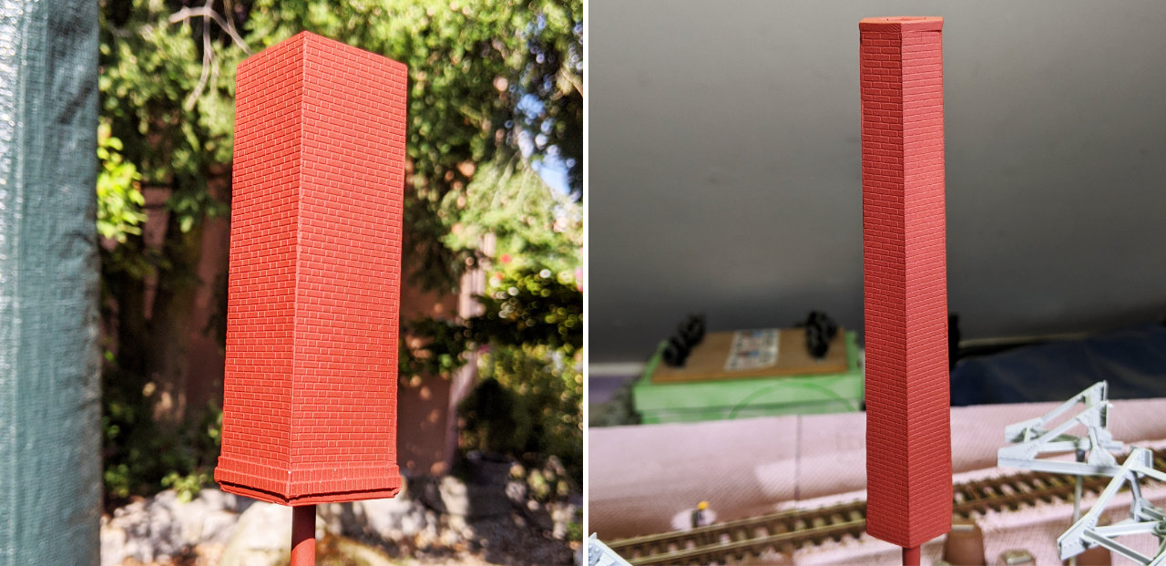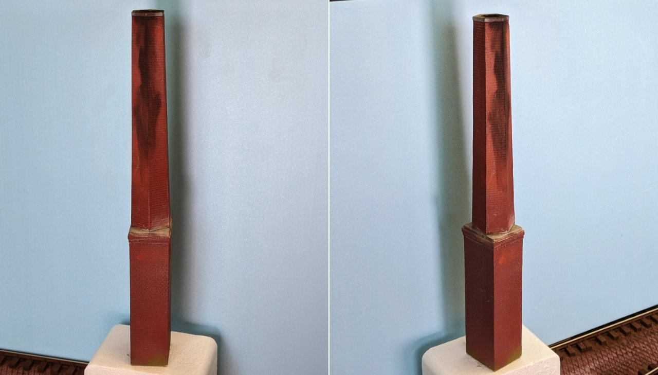 Als Kamin kommt nun der von MĂŒllers Bruchbuden mit rund 27cm Höhe zum Einsatz. Der Resin-Bausatz beinhaltet zwei Teile die stellenweise noch entgratet werden mĂŒssen und ggf. auf den StandflĂ€chen winkelig plangeschliffen werden sollten. FĂŒr beide Teile ist eine Klebeverbindung vorgesehen. Mir kam die Idee, beide Teile zusĂ€tzlich mit einem 6mm HolzdĂŒbel zu verbinden.