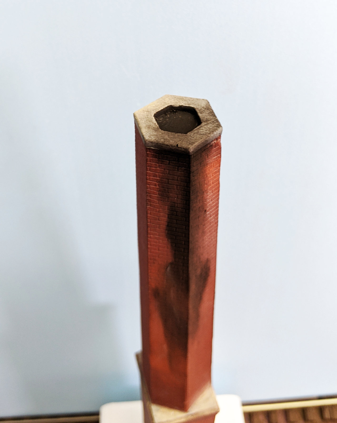 Von einem Freund erhielt ich gestern Abend noch den Hinweis, dass die RuĂablagerung am Kamin „zu heftig“ sei. Heute morgen habe ich nachgearbeitet und den RuĂ-Auftrag abgemildert.