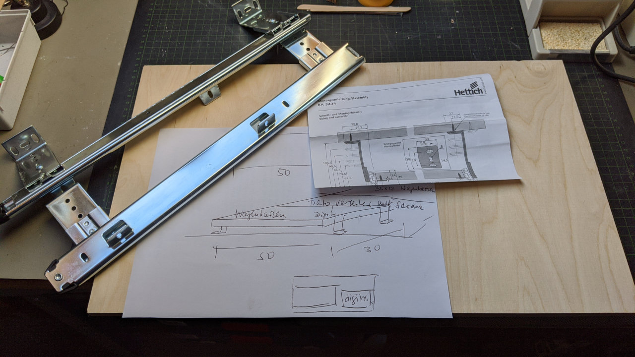 Was lag nĂ€her, als ein solches SchrĂ€nkchen fĂŒr den Auszug vorzusehen. Es ist nicht der klassische Fall, bei dem der Auszug darunter hĂ€ngt. Bei mir ist es genau umgekehrt, der Auszug befindet sich auf dem SchrĂ€nkchen.