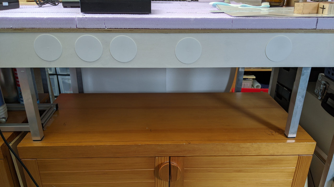 Meine Segmente stehen auf Aluprofil-Beinen, die entweder bis zum FuĂboden reichen oder auf SchrĂ€nken ruhen.
