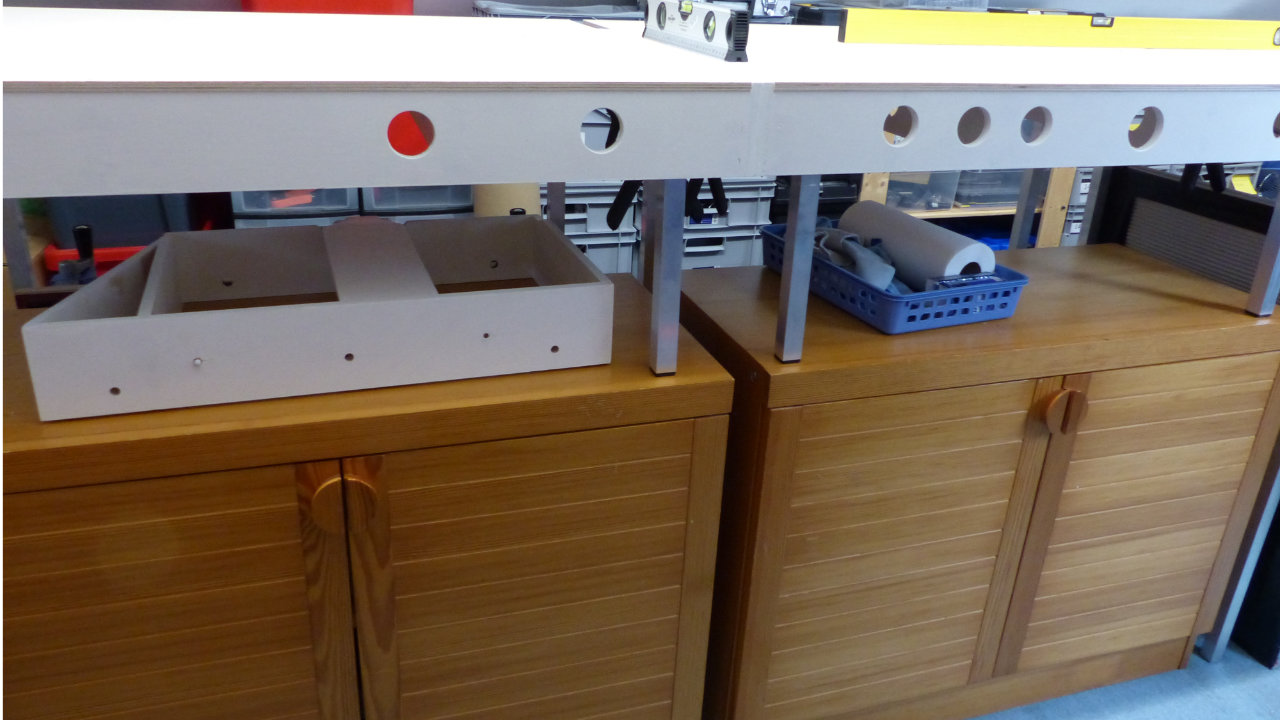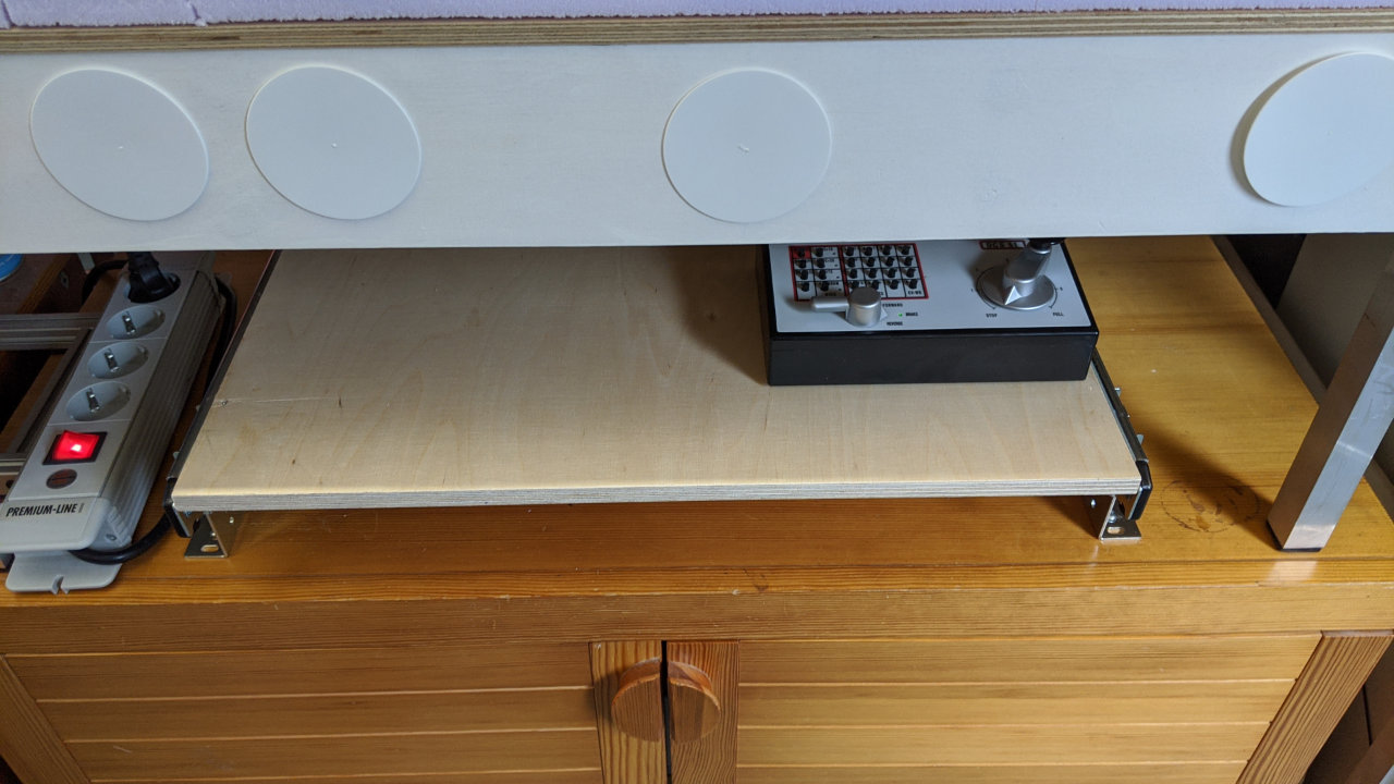 Last but not least kann ich auch noch meinen kleinen PrĂŒfstand unter dem Auszug parken. Ein gewisses GefĂŒhl von Zufriedenheit stellte sich ein, das Wochenende war gerettet.