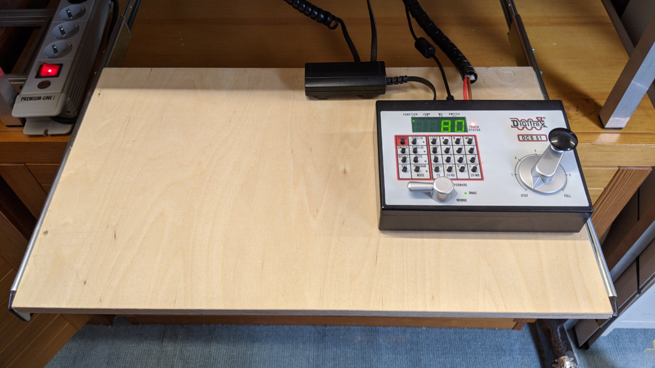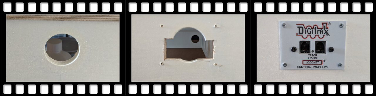 Den habe ich eingebaut. Ein runder Ausschnitt fĂŒr eine (ursprĂŒngliche H0-Planung) WeichenhandbetĂ€tigung war schon da. Der musste nur fĂŒr den Einbau des UP5 LocoNet Universal Panel vorbereitet werden. Der Rest ging flott von der Hand.