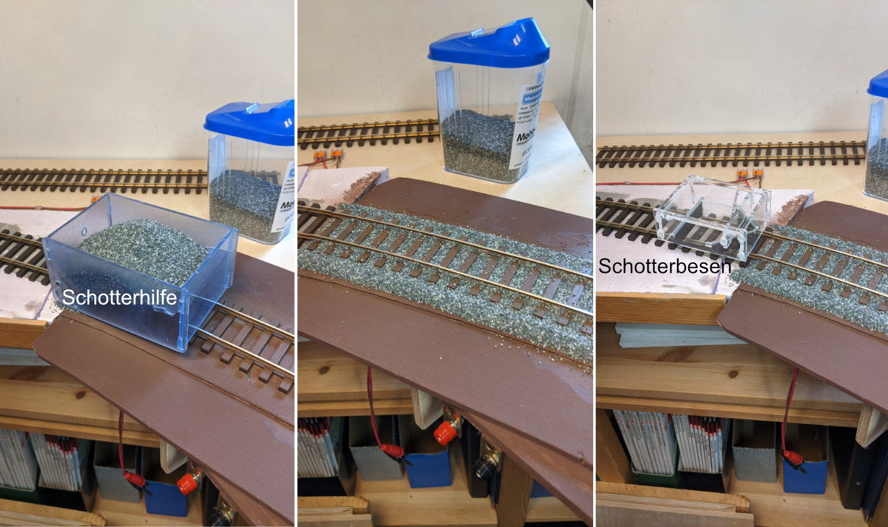 Mit der Schotterhilfe war der Schotter im Nu eingebracht. Der Schotterbesen kehrte die Schottersteine aus dem Gleis und schichtete diese am Rand der Schwellen auf. Die wenigen Schotterkörner, die dann noch auf den Schwellen lagen, habe ich mit einem kleinen Pinsel in die SchwellenzwischenrÀume geschoben.