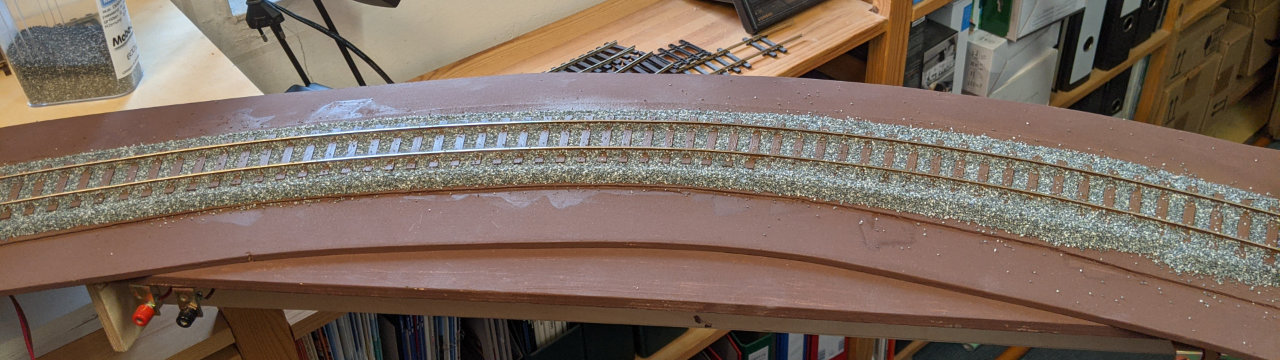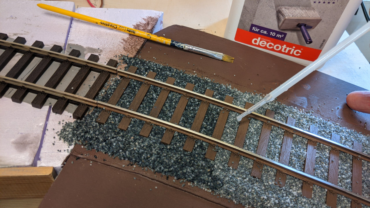 Auf den ersten 10 cm habe ich dann mit der Pipette den Tiefengrund eingebracht. Jetzt bin ich gespannt, ob der Tiefengrund nach der Trocknung das Schotterbett ausreichend fixiert oder ob ich ggf. eine andere Klebemethode einsetzen werde.