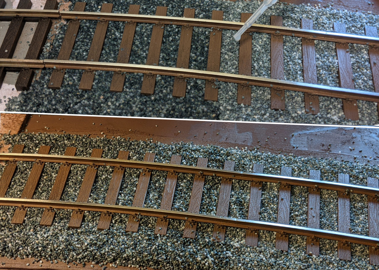 Das Schotterbett ist fest und trocken. Deshalb habe ich einen Bildvergleich versucht, wohl wissend, dass die LichtverhĂ€ltnisse nicht 1:1 den gestrigen entsprechen. Trotzdem meine ich, dass der verklebte Schotter wieder heller wurde und der Kontrast zum unbehandelten Schotter nicht mehr so stark ausfĂ€llt. AuĂerdem ist eine farbliche Nachbehandlung des Schotterbettes noch ausstehend.