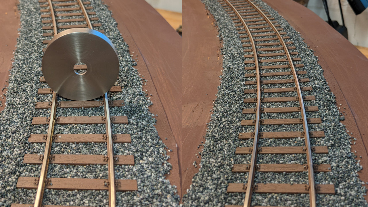 Die fĂŒr die Epoche III typische Absenkung des Schotterbettes zur Gleismitte hin habe ich versucht, mit einem vorhandenen Rund-Teil einer Gardinenstangen-Halterung zu erreichen. Vor betrĂ€ufeln des Schotters mit Tiefengrund einfach zwischen die Schwellen eindrĂŒcken. Gut, das könnte man auch professioneller machen indem eine Schablone/ein Stempel angefertigt wird. FĂŒr meine AnsprĂŒche genĂŒgt aber diese quick and dirty Lösung.