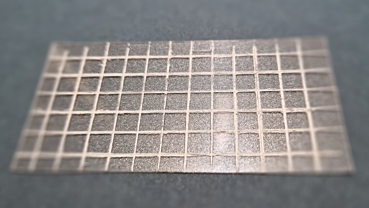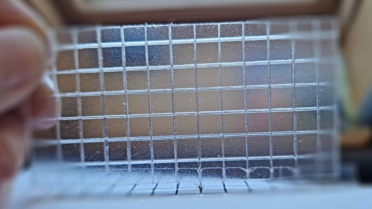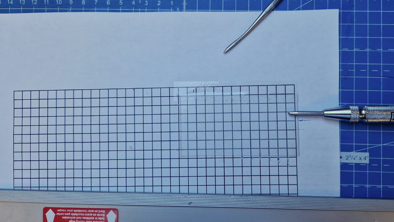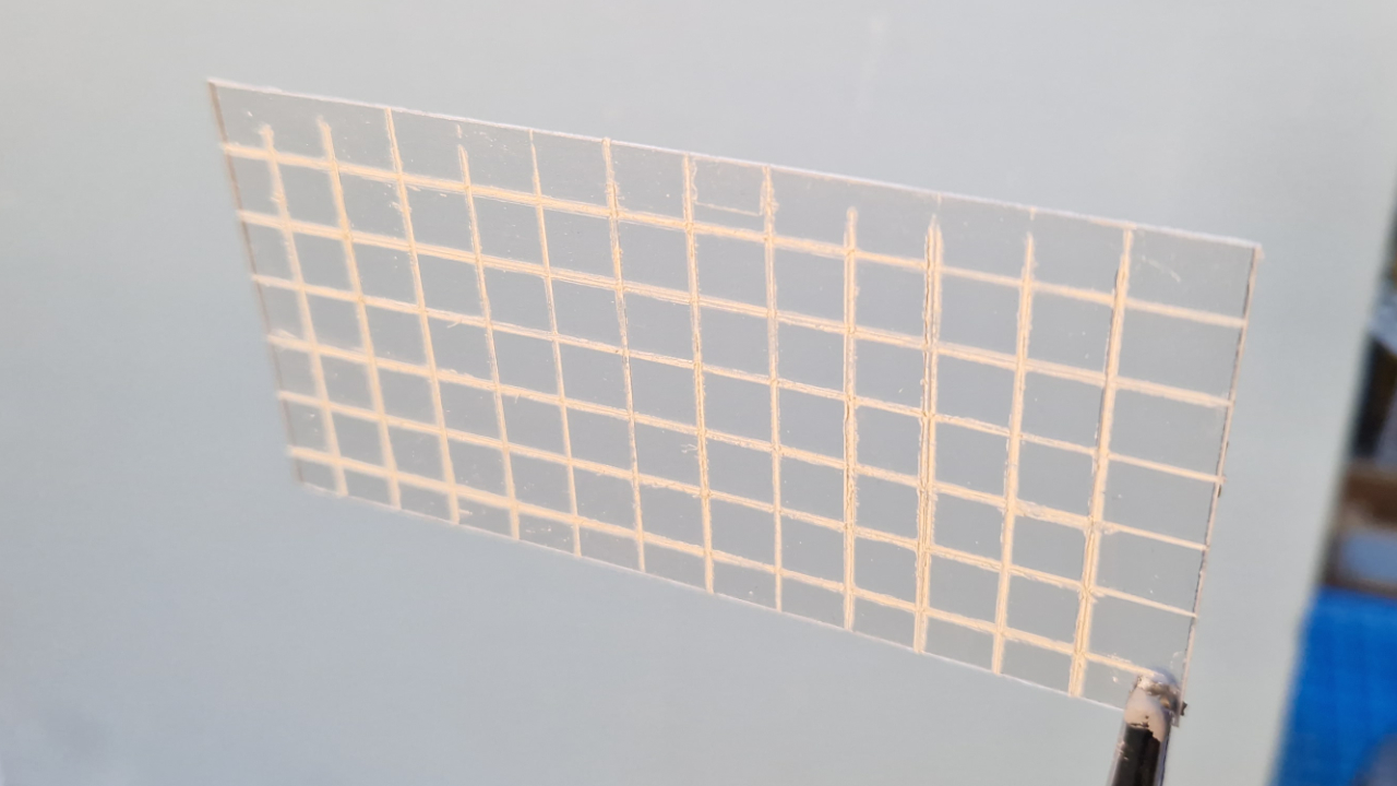 Basis war ein schon vorhandene Papierausdruck der Glasbaustein“wand“. Darauf legte ich ein StĂŒck PVC-Folie ( 1,5mm dick, satiniert) und gravierte die Linien mit einem passenden Stichel in die Folie.