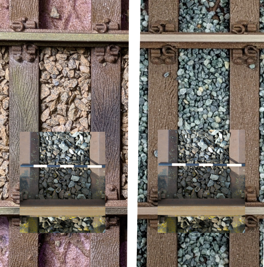Die Diskussion führte dazu, dass ich an meiner Baustelle Kleinreuth-Nord Probe-Schotterungen durchführte und diese -nicht fixierten- Schnipsel fotografierte um einen fotografischen Vergleich Vorbild zu Modell durchzuführen. Die größenrichtige Fotomontage zeigt