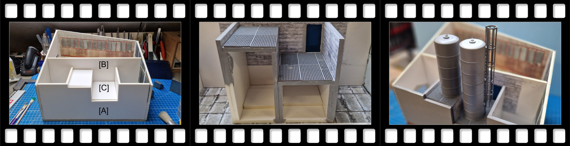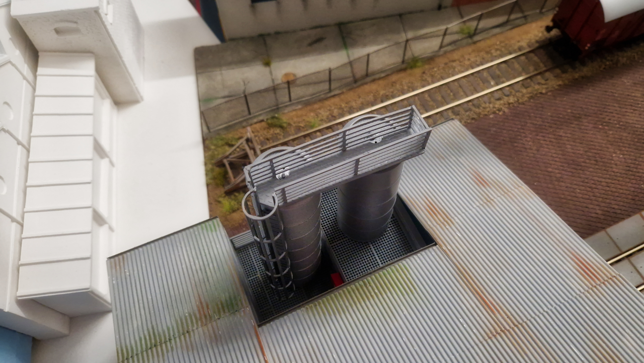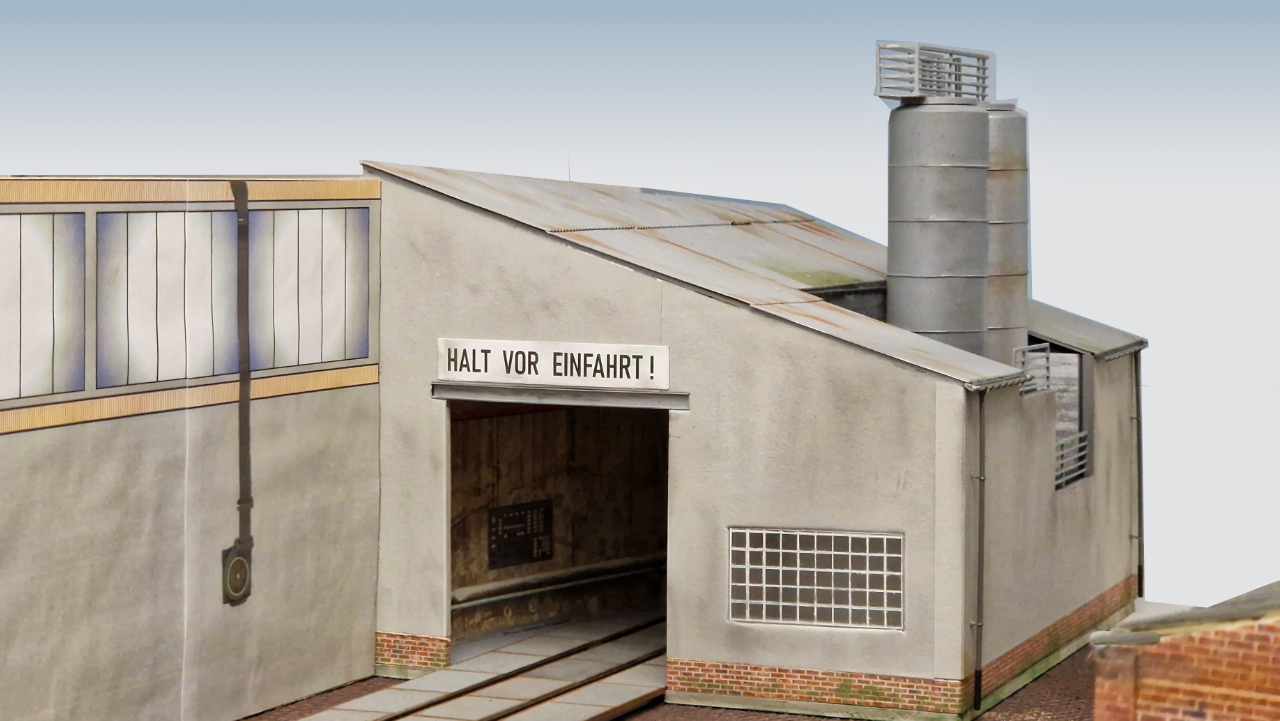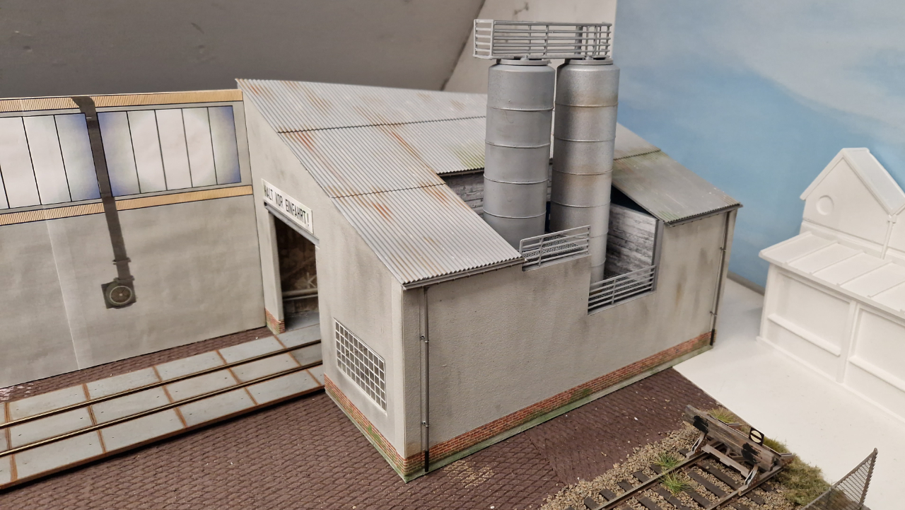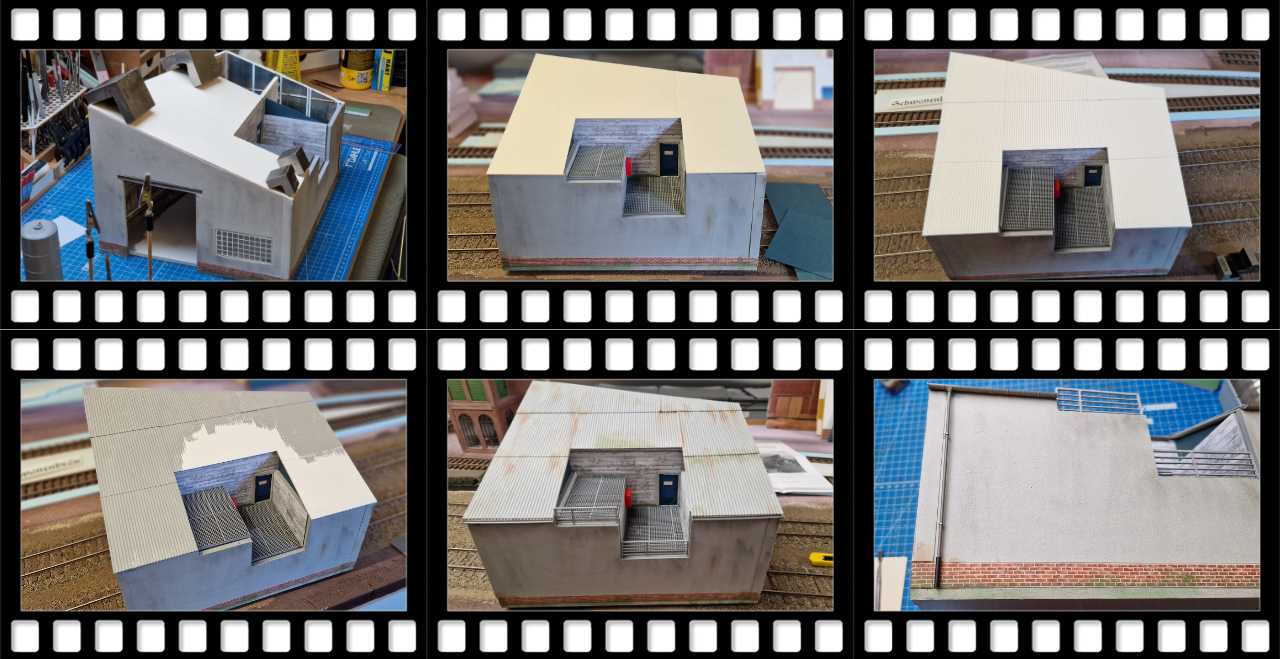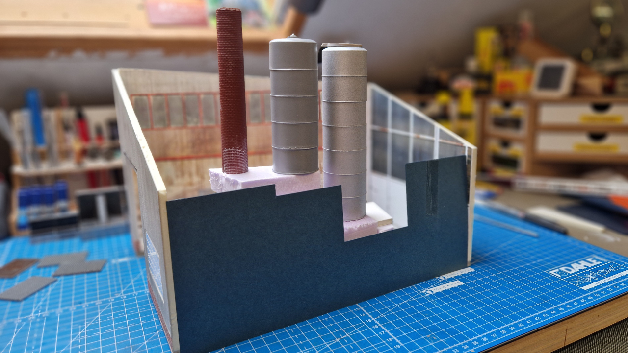 Dach-Unterbau aus Finnpappe zugeschnitten und verklebt. Wellblech-Bedachung zugeschnitten, verklebt, gestrichen und leicht gealtert, Dachrinnen und Fallrohre angebracht: