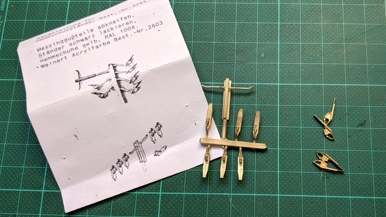 Da wartet doch noch etwas in meiner Vorratsschublade: Weinert #2569 Hemmschuh-StĂ€nder mit Hemmschuhen und ein paar Hemmschuhe von Hassler. Alle Teile aus Messing. Das war eine entspannende Nebenbei-Bastelei fĂŒr den Modellbahn-Samstag.