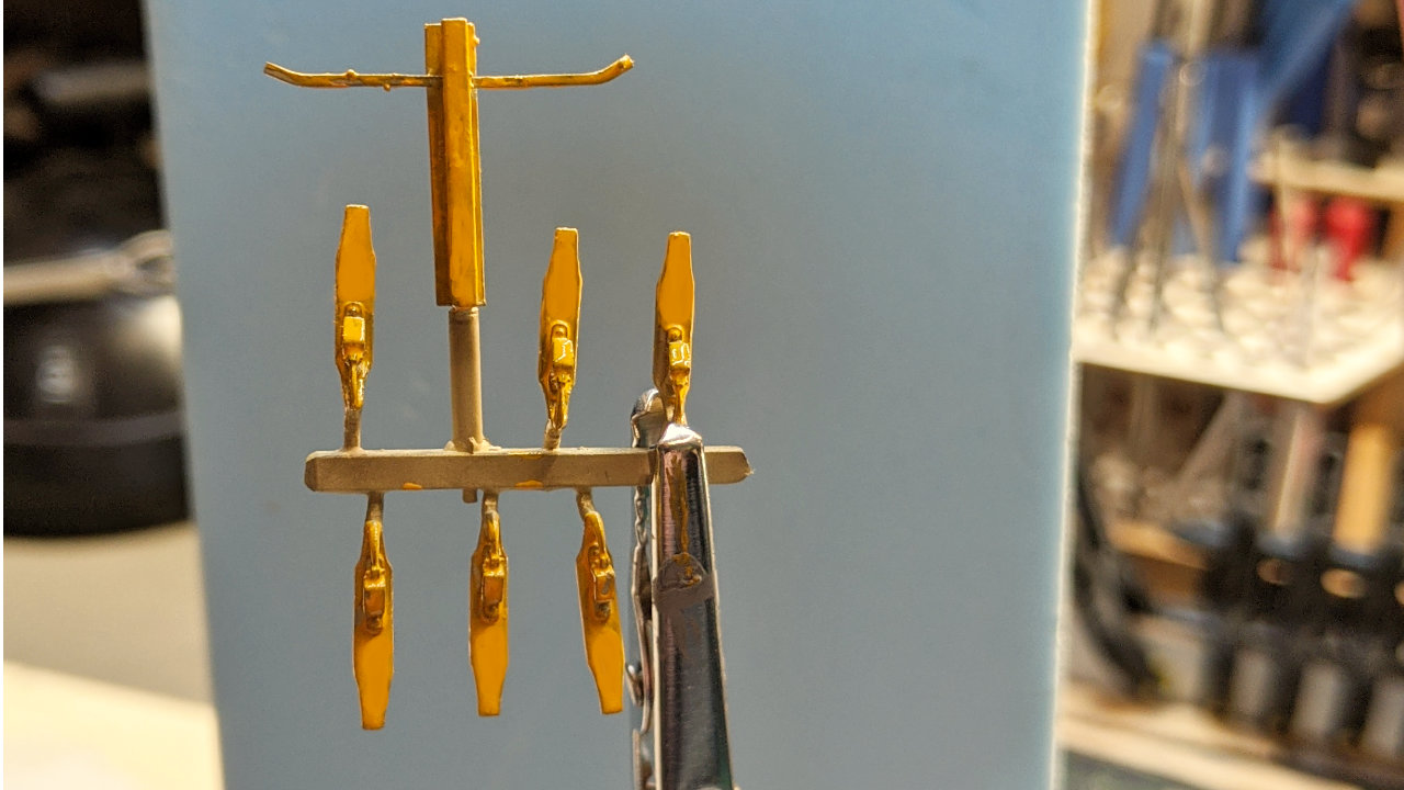 Die Teile wurden in bewĂ€hrter Weise mit ZahnbĂŒrste und 2-Propanol 99,5% entfettet und anschlieĂend mit einem Edding Lackstift in Verkehrsgelb lackiert. Nachdem der Trocknungsvorgang fortgeschritten war habe ich den Teilen noch die notwendigen Witterungsspuren mit rostbraunem PĂŒlverchen verpasst.