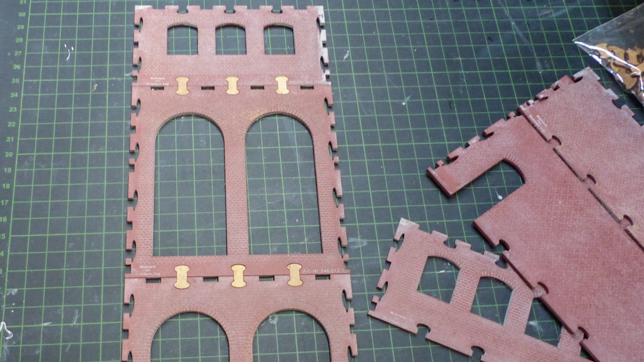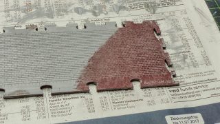 Wichtig: Die den Mauerelementen beigefĂŒgten Verblender sind aus dĂŒnnem Material, vermutlich Karton und vertragen somit nicht eine „intensive“ Abwisch-Orgie. Hier also die Plakafarbe auftragen und anschlieĂend sofort wieder -vorsichtig- abwischen. Immer das Material beobachten und nicht zu krĂ€ftig wischen, damit sich die gelaserte Struktur nicht auflöst.