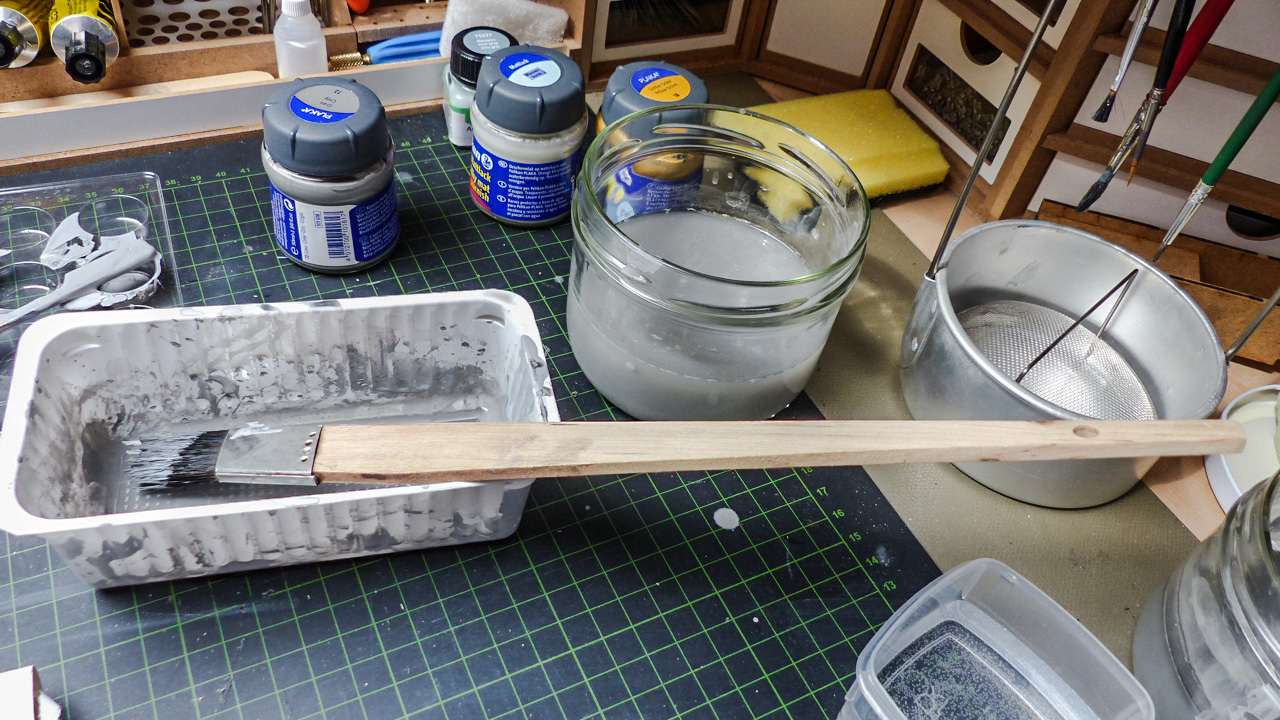 Verwendet habe ich zuerst Kreul Acryl Mattfarbe Blaugrau (#75227). Die Farbe wird mit einem Pinsel deckend aufgetragen und anschlieĂend sofort mit einem feuchten Schwamm wieder abgenommen. Mit einem weichen, saugfĂ€higen Tuch werden die Farbreste von der OberflĂ€che weggewischt, aber in den Fugen belassen. Diese Prozedur kann im Bedarfsfall wiederholt werden. Meine Erfahrung mit dieser Farbe: FĂŒr meinen Einsatzzweck leider nicht geeignet, da die matte OberflĂ€che nach dem abwischen der Farbe einen leichten Glanz bekam.