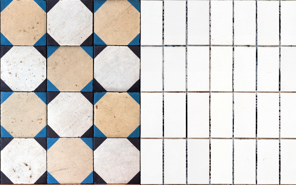 Fliesen fĂŒr Wand und Boden fand ich bei textures.com. Als registrierter Benutzer dieser Website kann ich kostenlos eine (pro Tag) begrenzte Anzahl von Mustern in einer akzeptablen Auflösung herunterladen. Ich entschied mich fĂŒr eine lĂ€ngliche weiĂ-graue Fliese fĂŒr die WĂ€nde und ein farbiges Muster fĂŒr den Boden.