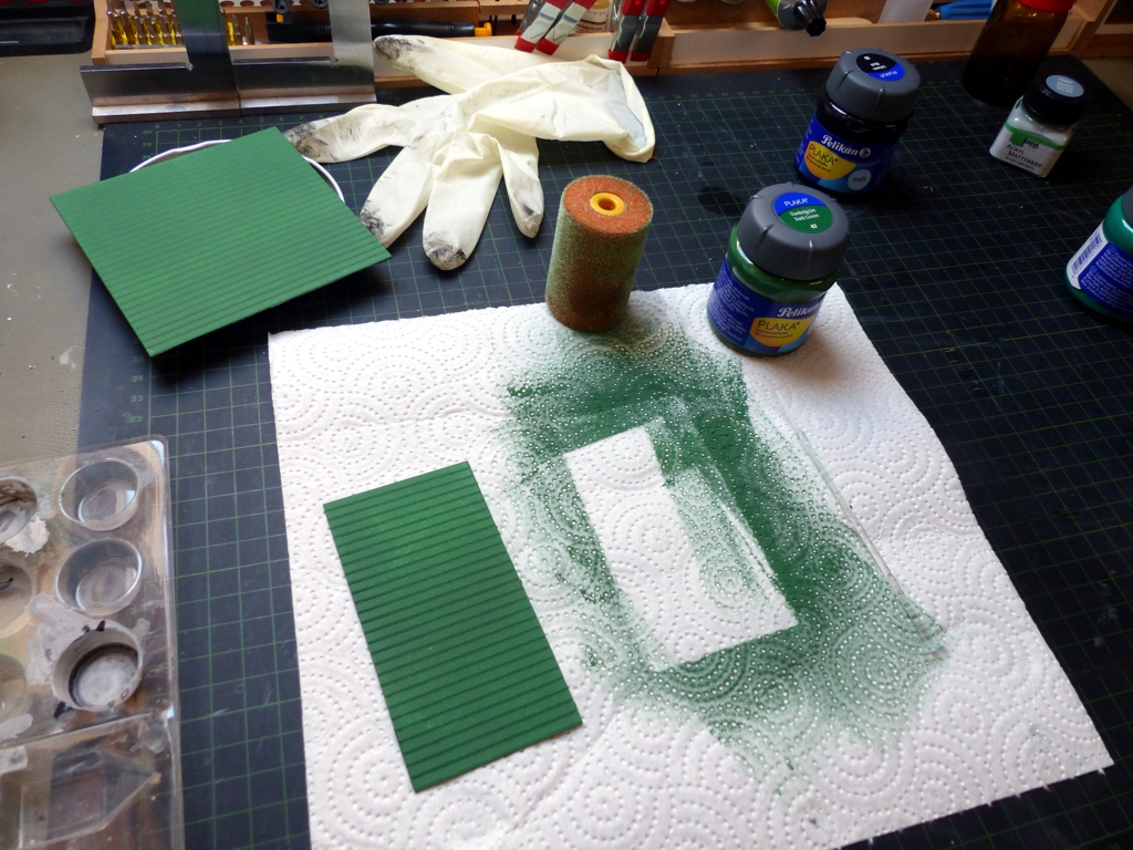 Zur Gestaltung der Lamellenfenster verwendete ich ausschlieĂlich Farbe (Plaka schwarz, grĂŒn und ein brĂ€unliches Washing).
