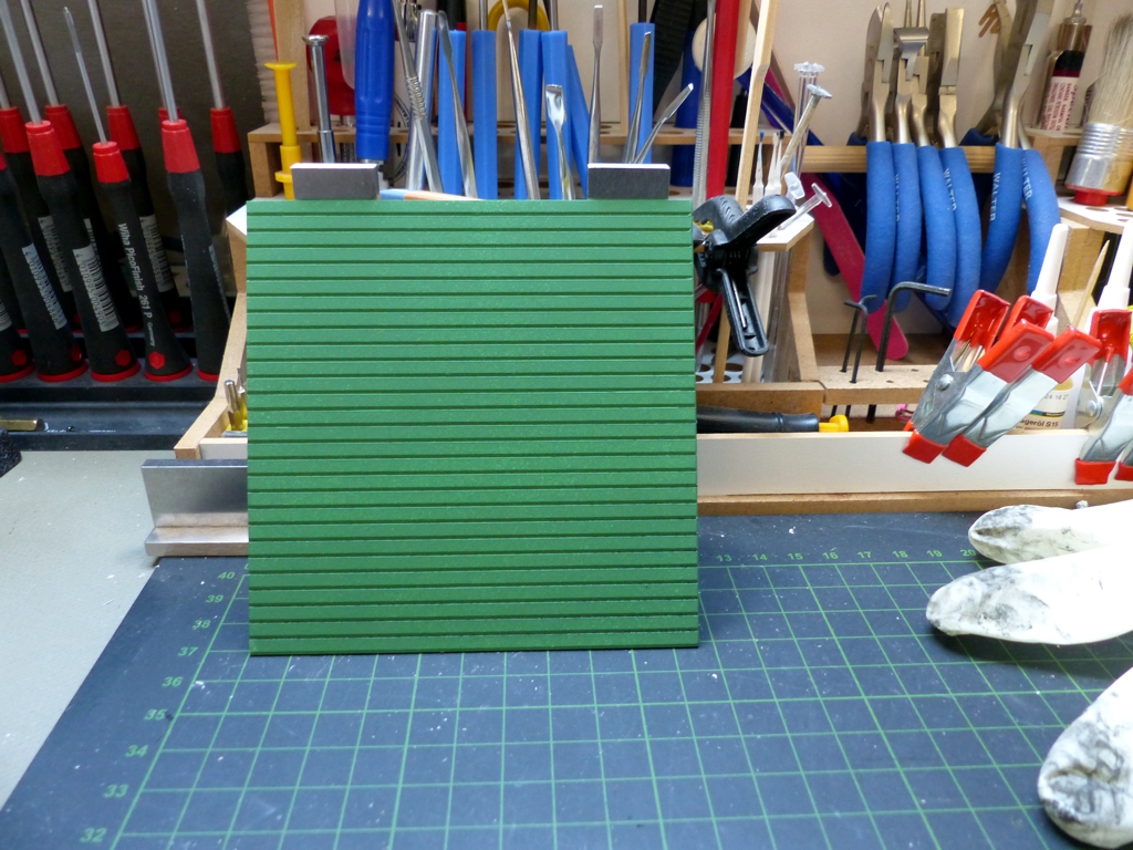 Den Aufwand, einzelne Lamellen zu zuschneiden und zu einem ganzen Fenstereinsatz (*3) zusammenzusetzen, wollte ich nicht betreiben. Ich entschied mich fĂŒr eine Bauplatte #4150 Novelty Spacing 3,8mm von Evergreen. Diese hat in etwa den „Zuschnitt“ fĂŒr Lamellen/Jalousien.