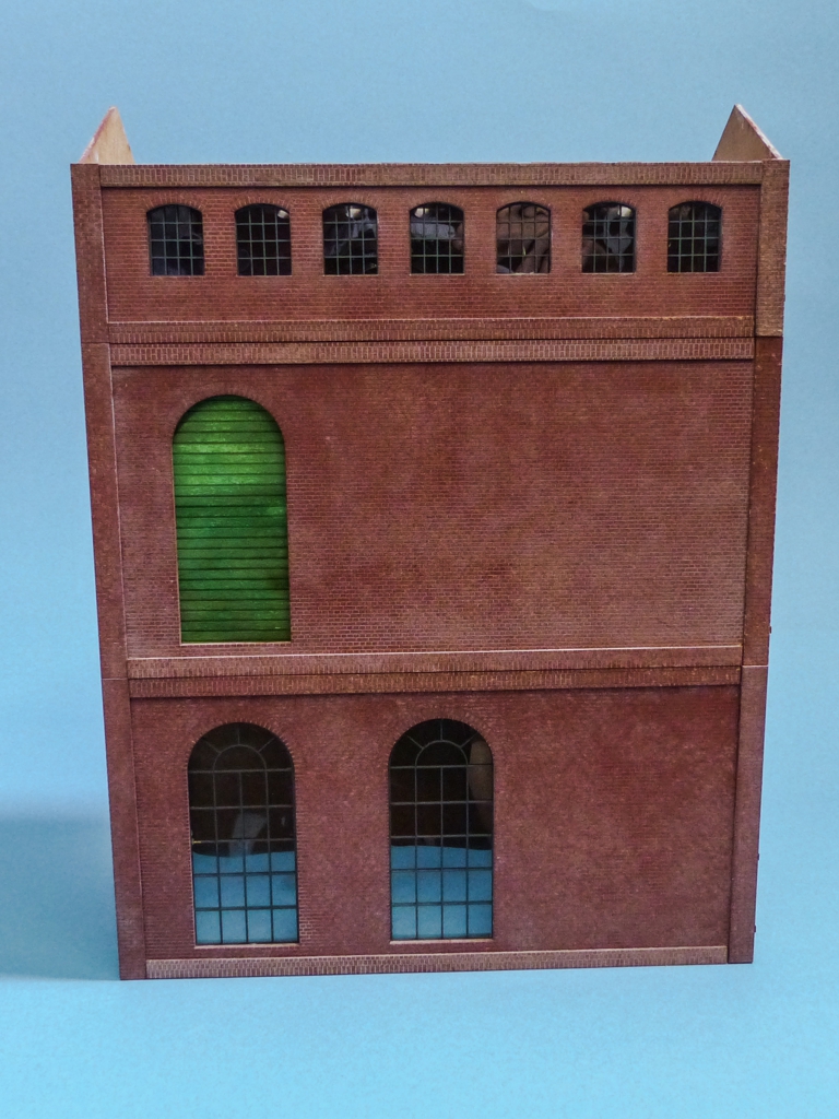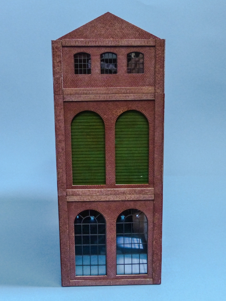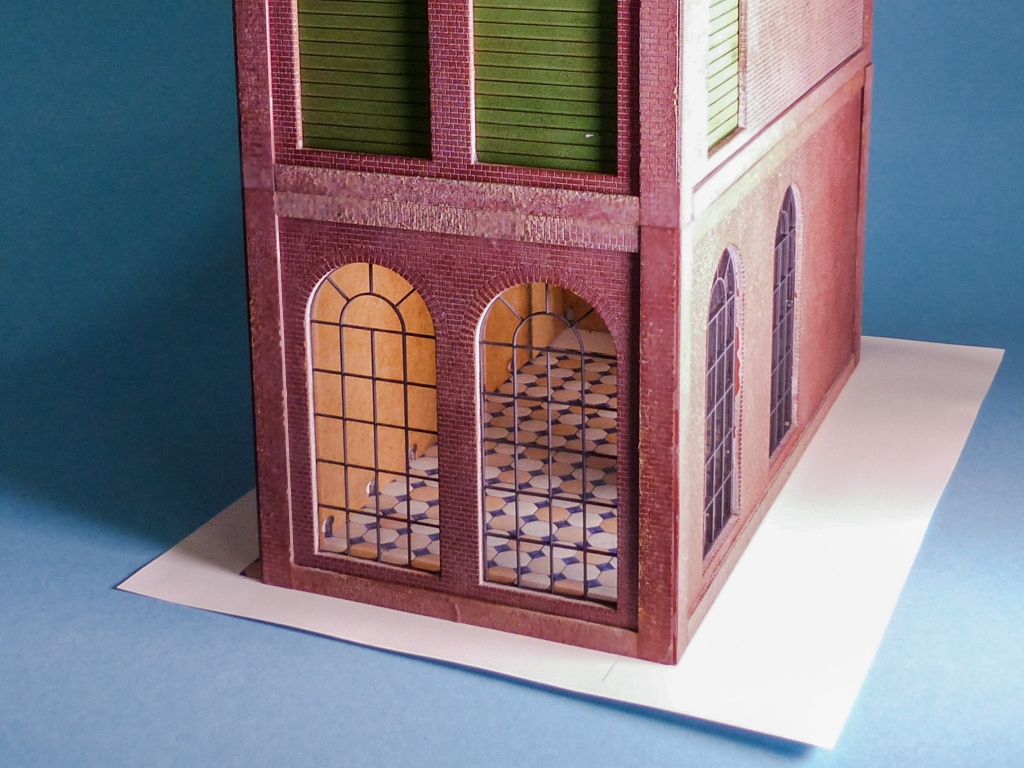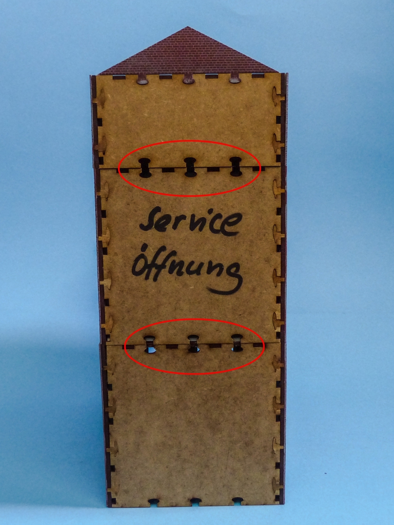 Beim hantieren mit dem GebĂ€ude bemerkte ich, dass bedingt durch den Zwischenboden EG/OG keinerlei Eingriffsmöglichkeit mehr bestand. Nach kurzer Ăberlegung entschied ich mich, eine „Service-Ăffnung“ auf der ungestalteten RĂŒckseite vorzusehen. Dort habe ich die Verbinder-Elemente nach oben und unten entfernt. Damit kann dieser Teil der RĂŒckwand jederzeit entfernt werden.