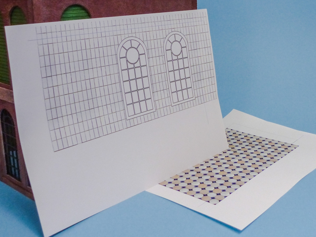 Diese Fliesenmuster habe ich dann skaliert, die erforderlichen Fensterausschnitte eingepasst und alles mit dem Farblaser auf Fotopapier gedruckt. Als erster Eindruck nur mal zwei Bilder, eines davon mit den untergelegten Bodenfliesen.