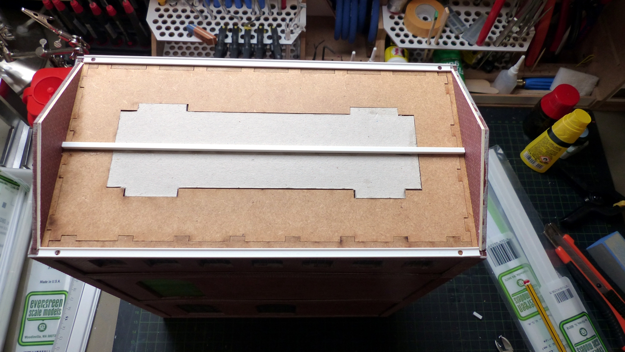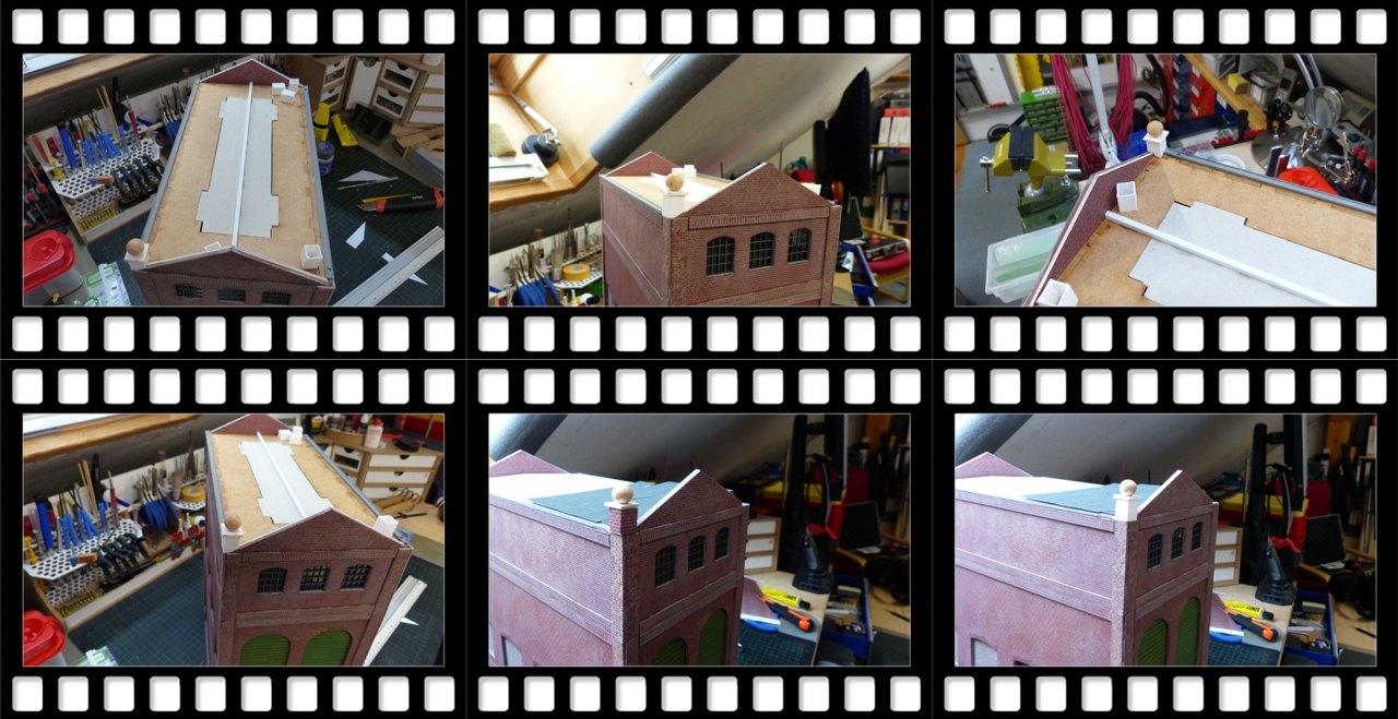 Die betonierte Dachrinne besteht aus Evergreen U-Profil 4,8 x 1,6 mm. Die (gedachte) EntwĂ€sserung erfolgt ĂŒber innenliegende Fallrohre wie sie bei Industriebauten oft anzutreffen ist. Zu den Giebelseiten hin ist natĂŒrlich eine Verblechung vonnöten. Material: Evergreen L-Profil.