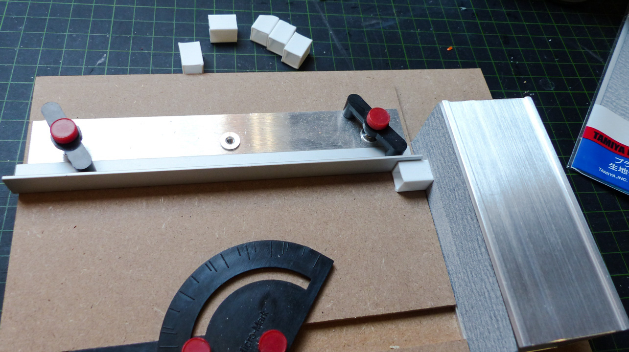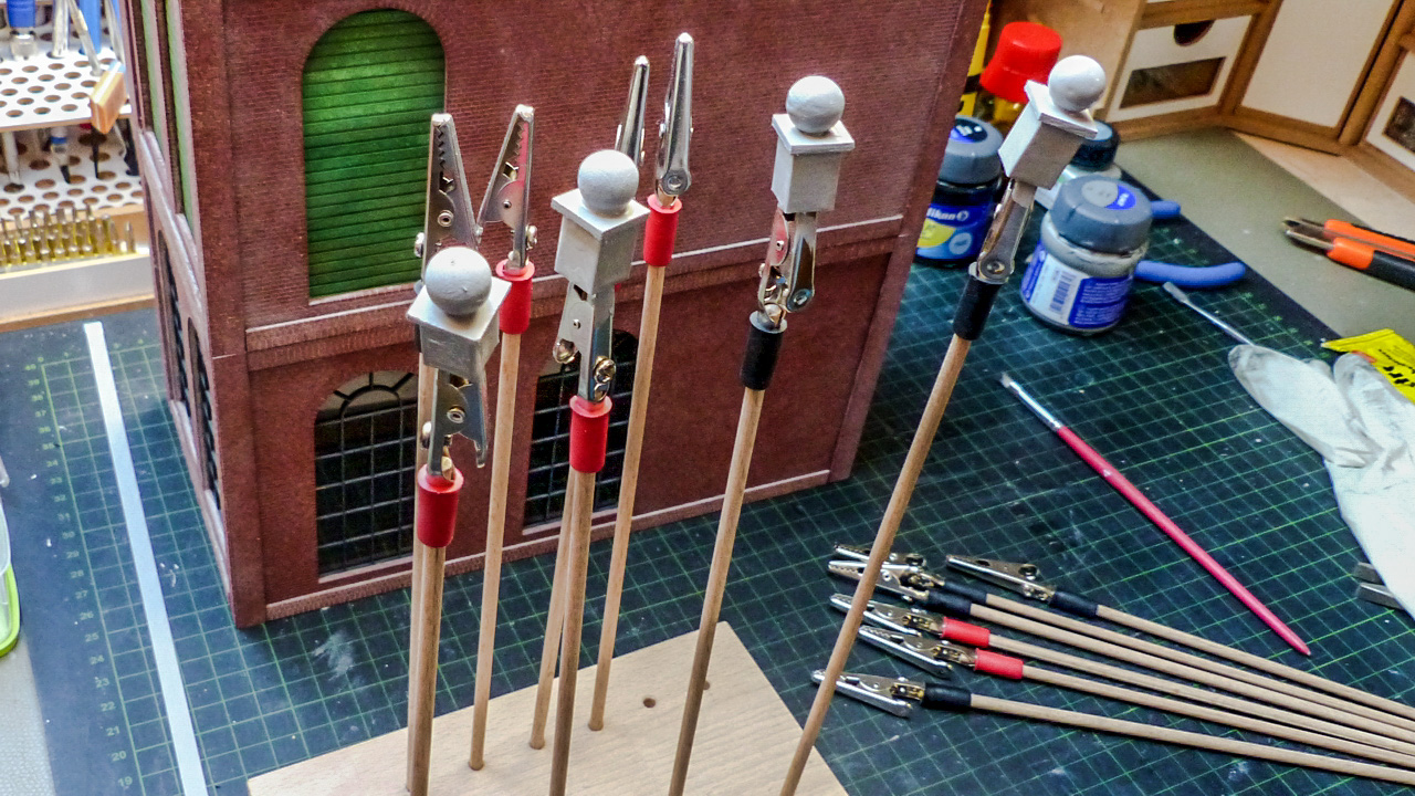 Den ersten Ansatz, die kurzen TragsÀulen in Ziegelstruktur nachzubilden, habe ich wieder verworfen. Es ergab einfach kein homogenes Bild. Ich bevorzugte daher eine Beton-Konstruktion. Material: Evergreen Quadratrohr 9,5 x 9,5 mm, Zwischenplatte aus Architekturkarton, Holzkugeln Buche 10,0 mm halbgebohrt. Die Kugel wird mit einem 1/3 Zahnstocher durch eine mittige Bohrung in der Abdeckplatte und Uhu ausreichend gut fixiert.