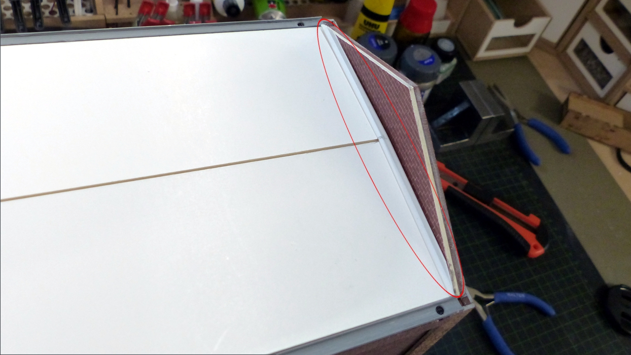 Damit das Regenwasser auf dem „Flachdach“ nicht stehen bleibt sorgt ein Sattel durch eine 5 mm Vierkantleiste fĂŒr die notwendige Neigung.