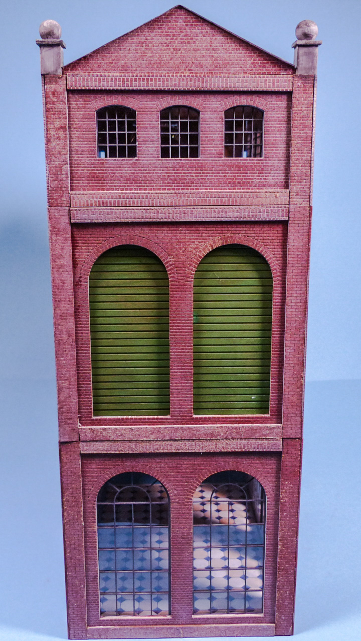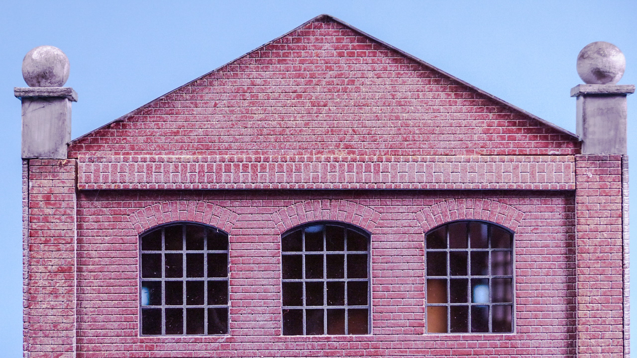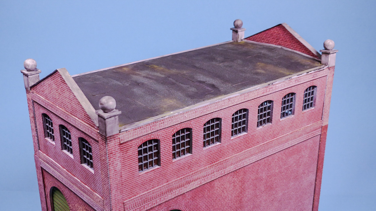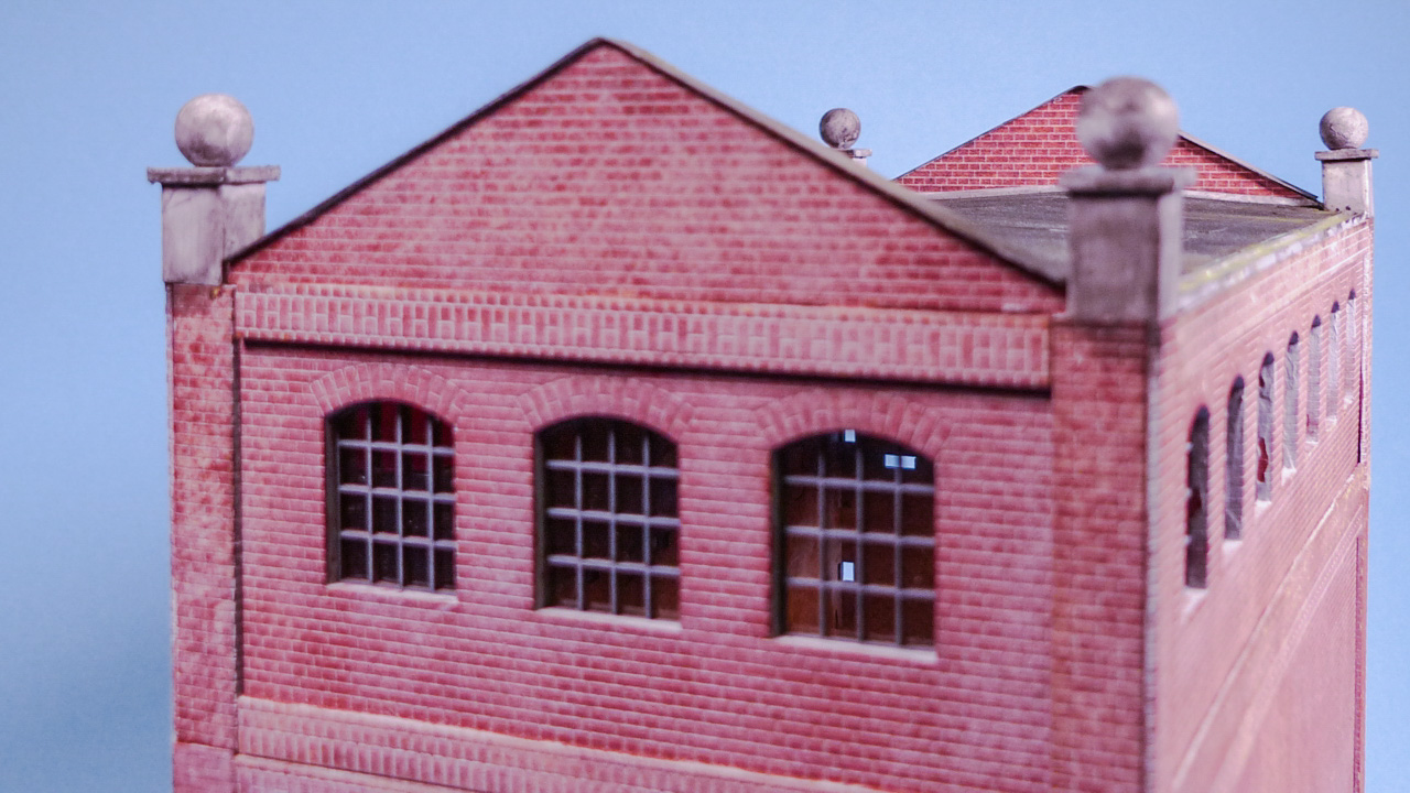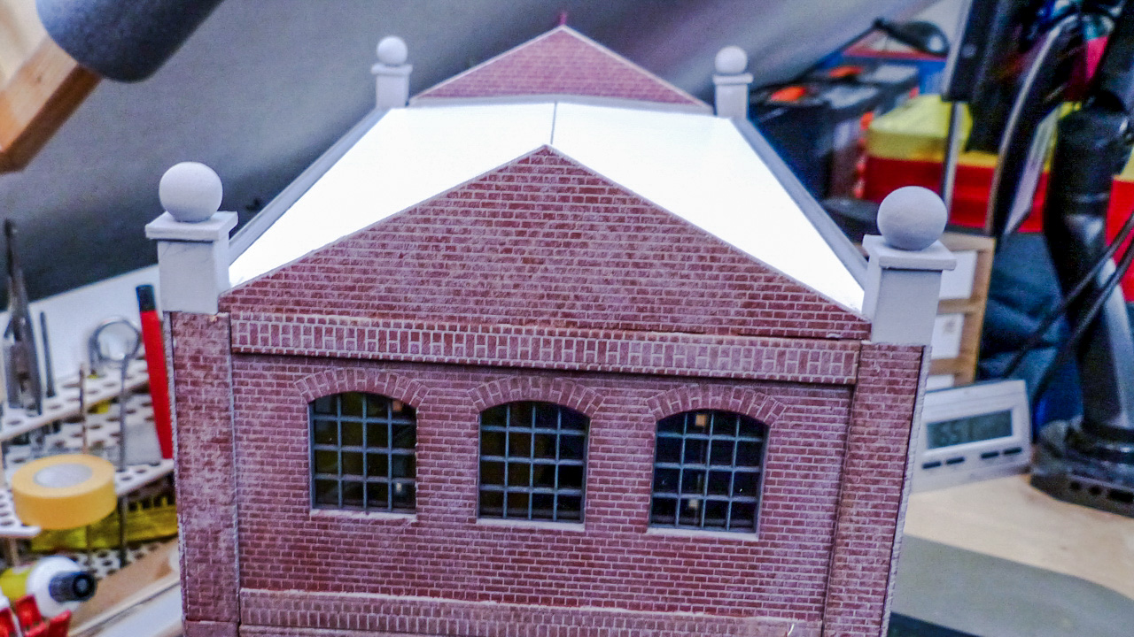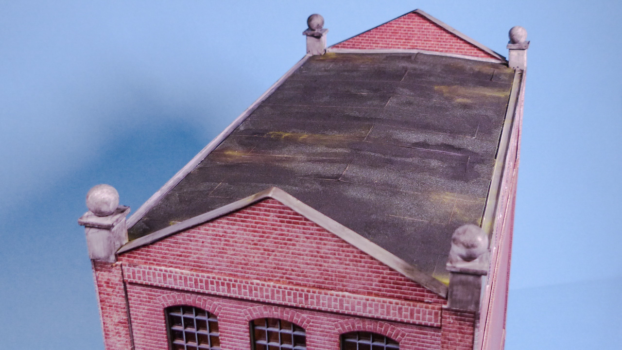 Zuerst habe ich beide Giebel mit Architekturkarton „aufgedoppelt“ um eine glaubwĂŒrdige WandstĂ€rke zu erreichen. Die Ziegelstruktur wurde mit Paperbrick erzeugt.