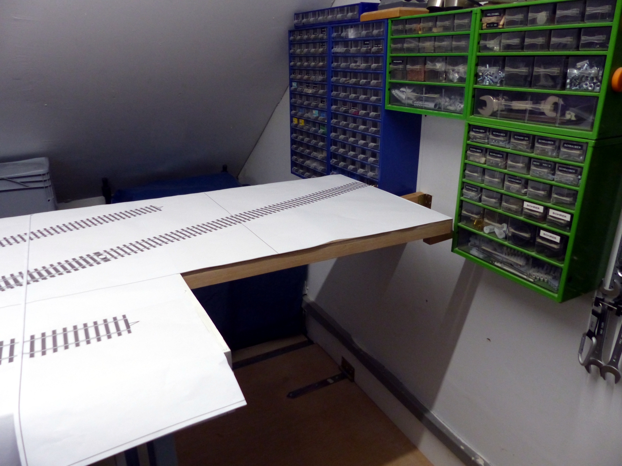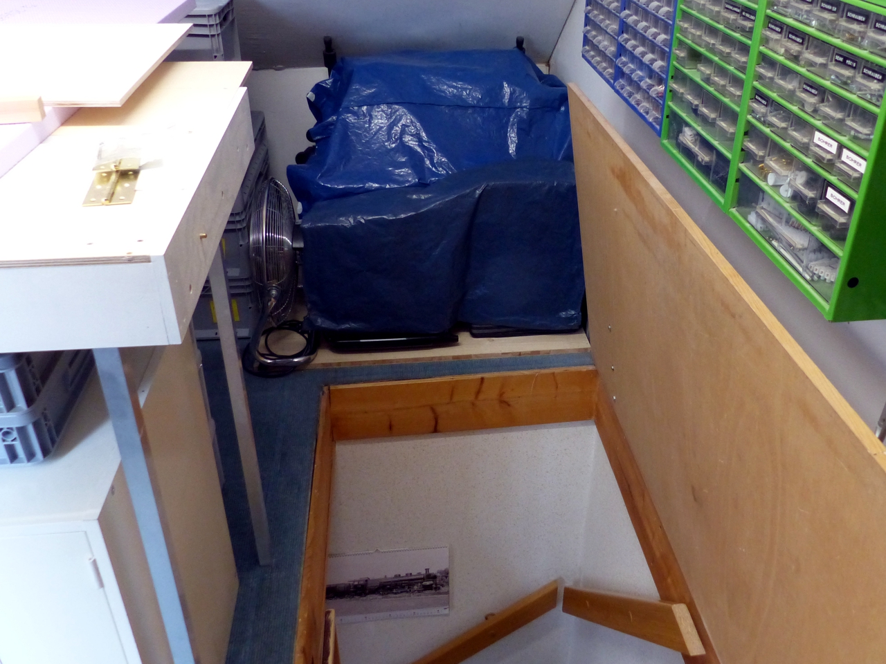 „Was ich in H0 und erst recht in 0 machen würde, ist ein anhebbares Segment über der Treppe. Die 85cm-90cm sind „zu schade“ um nichts daraus zu machen. Man kann es ja nach oben heben (Seilzug) und muss es nicht wegheben. Das würde Dir wichtige Nutzlänge geben, da Du Dein Umfahrgleis länger machen kannst.“