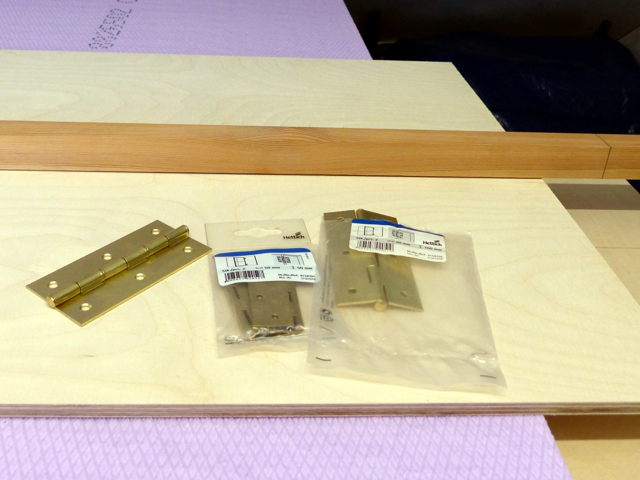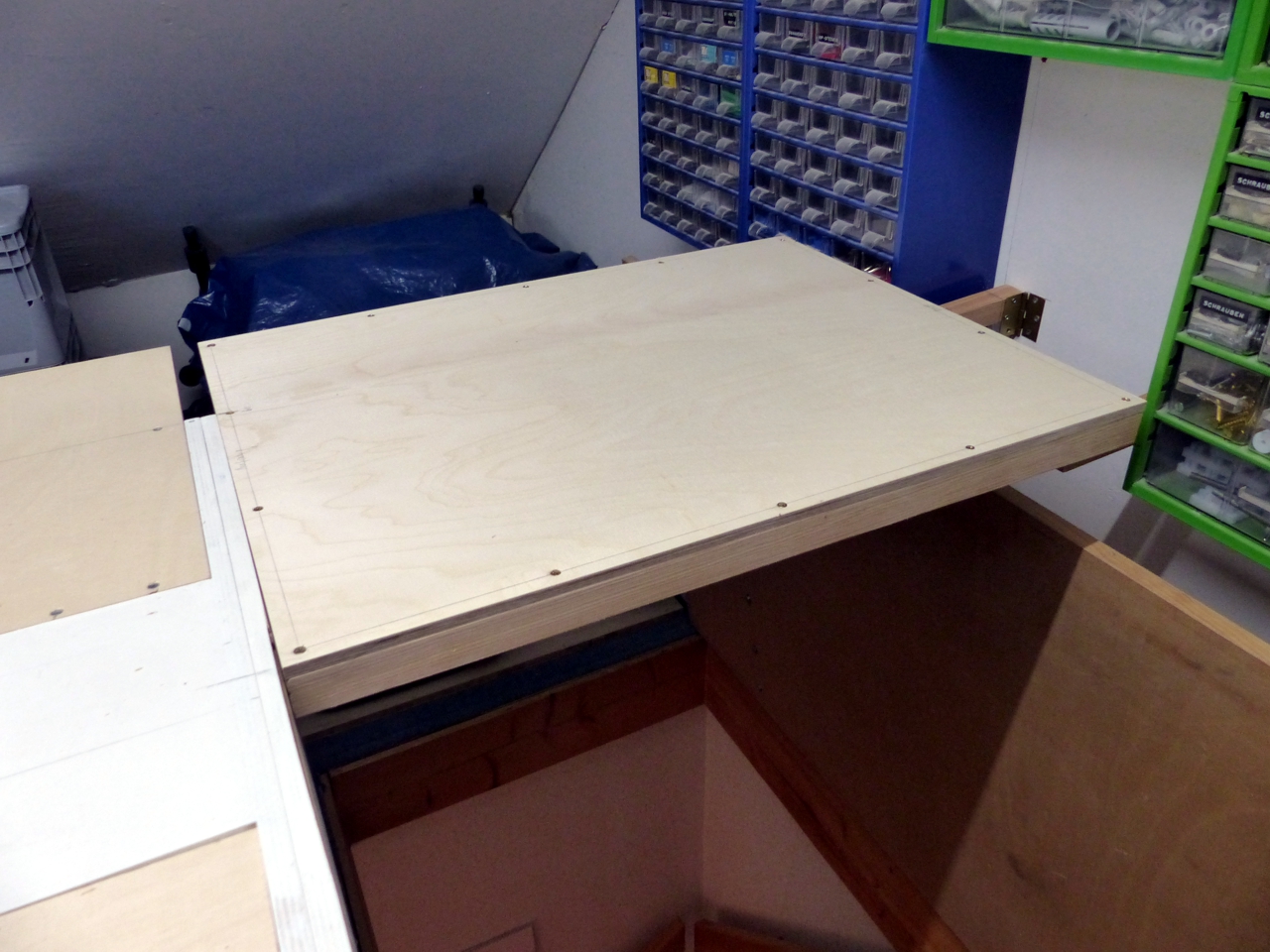 Ich entschied mich für eine abklappbare Lösung mit den „Zutaten“ Birken-Multiplex-Verlängerungsplatte 50*65 cm mit 2,5×2,5 cm Rahmen, Möbelscharniere von Hettich, montiert an ein Segment-Kopfstück mit Passstiften (war noch vorrätig). Dadurch ist die Verlängerung abnehmbar und behindert nicht eventuelle Unterflurmontagearbeiten am vorhergehenden Segment.