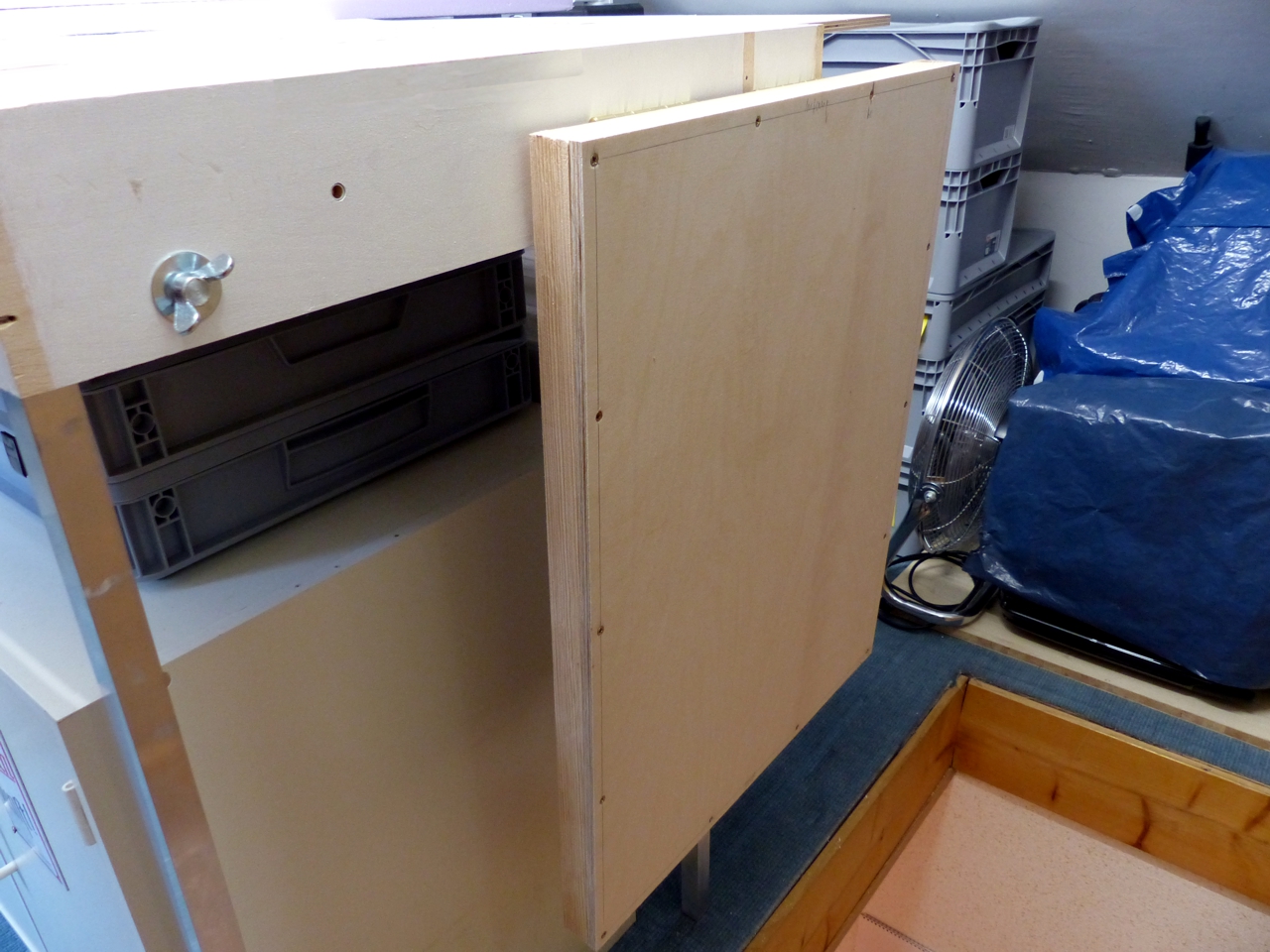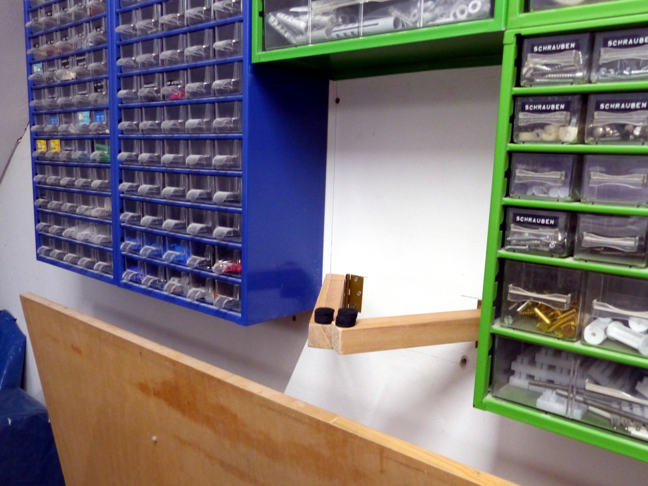 Auf der rechten Seite (bei den Raaco-Kästen) sind schwenkbare Halter als Auflage für die Verlängerungsplatte montiert.